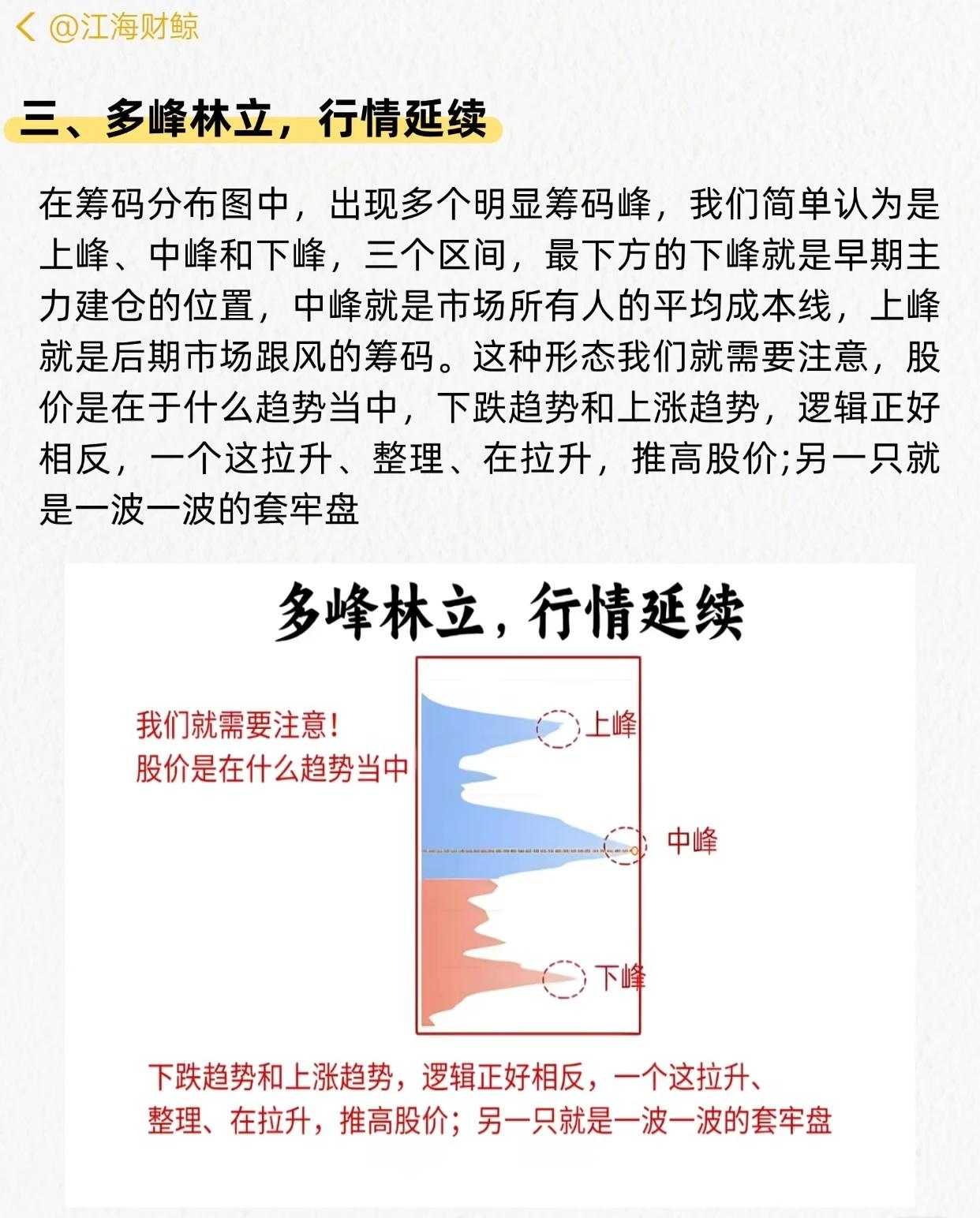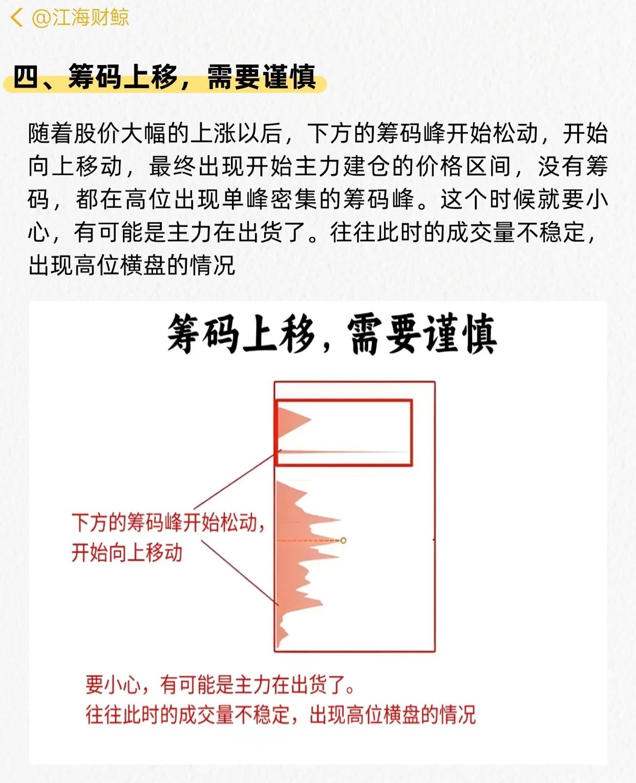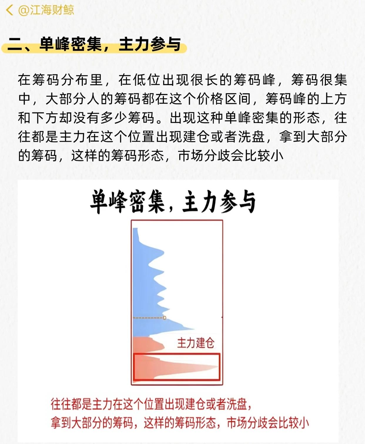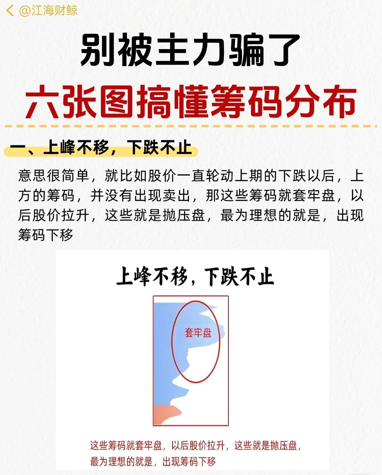 筹码分布六大形态速记: 上峰不移,下跌不止 上方套牢盘未消化,股价拉升易遇抛压,理想状态是筹码下移。 单峰密集,主力参与 低位出现单一集中筹码峰,多为主力建仓或洗盘,市场分歧小。 多峰林立,行情延续 上、中、下多峰并存,需结合趋势判断:上涨趋势推高股价,下跌趋势形成套牢盘。 筹码上移,需要谨慎 股价大涨后低位筹码消失、高位形成新峰,警惕主力出货,伴随量不稳和横盘。 下峰锁定,上涨未尽 低位筹码峰未松动,说明主力未派发,目标未完成,后市看涨。 双峰填谷,上下震荡 上峰压力大、下峰支撑强,股价横盘或箱体震荡,震荡越久筹码越密集,等待方向选择。