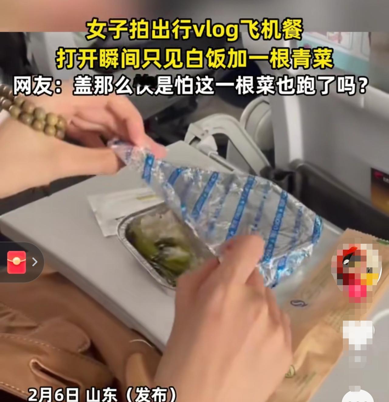 伤害性不高侮辱性极强!山东,一女子坐飞机出行,飞机起飞不久空姐就端上来飞机餐,万万没想到,女子把盖子打开一看,里面就只有一碗饭加一根青菜,吓得女子连忙盖上了盖子。网友:盖那么快是怕这一根菜也跑了吗? 2026年2月7日,山东上空万米高处。并没有遇到剧烈的气流颠簸,但客舱里却传来一声清脆的塑料撞击音。那是一只餐盒被猛然揭开,又在0.5秒内被迅速扣死的声音。 镜头前的这位女士原本兴致勃勃。她端坐在镜头前录制Vlog,神情专注且带着几分雀跃。忽然,她眼眸闪烁着期待的光,扬起声音,清脆地喊了句:“吃饭吧。”然而,当那个盖子掀开的一刹那,预想中的烟火气并没有出现。 视野里只有大面积惨白的米饭,和那一根孤零零、翠绿得有些尴尬的青菜。这画面带来的视觉冲击力太强,以至于身体比大脑先做出了反应——“啪”地一声,她本能地把盖子盖了回去。那感觉,仿佛多看一眼都是对饥饿感的冒犯。 这段视频传回地面,在网络空间里引发了一场关于“幽默防御”的狂欢。有人调侃说,盖得这么快,是怕这根唯一的青菜趁机跑了吗?还有人信誓旦旦地分析,肉大概是埋在了饭底下,这是航司给你的寻宝游戏。 喧嚣过后,当事人出来复盘了真相。这其实是一场由工业设计引发的误会:餐盒是双头设计的,由于拍摄角度受限,她当时只掀开了其中一侧。另一侧确实还有少量的配菜。 但这个迟来的真相并没有像预想中那样平息波澜,反倒更像是一种无力的黑色幽默。因为即便把另一侧的配菜加上,从“一根菜”变成“几根菜”,依然无法改变那股扑面而来的寒酸气。误会是解除了,但那份透过屏幕都能溢出来的失望感,却是实打实的。 如果我们将视线从那个尴尬的餐盒移开,投向这架飞机的运营后台,会发现这一切都有着冰冷的数学逻辑。在2小时以内的短途航线上,除去起降爬升,留给空乘人员平稳服务的窗口期往往不足1小时。 在这个极限的时间夹缝里,要完成数百人的发餐、收餐,效率早已凌驾于口味之上。更深层的推手是那个隐形的“15元红线”。在如今机票价格极度内卷的市场上,经济舱的单份配餐成本被严格控制在15元以内。 当一张机票的价格甚至不如高铁票时,餐食就从曾经用来招揽客人的“服务亮点”,退化成了财务报表上必须被优化的“成本累赘”。这种计算极其精准,也极其残酷。 很多老派的旅客或许还会怀念以前的日子。那时候即便是经济舱,餐盘里也有热腾腾的主食、水果切片,甚至还有独立包装的小零食。而现在,这种记忆正在被现实一点点剥离。 调研数据显示,超过60%的乘客对短途餐食感到不满,吐槽集中在分量少、搭配单调。但这似乎并未改变什么,航司依然在“精简模式”上一路狂奔。 这不仅仅是一顿饭的消失,而是整个航空业从“高端服务业”向“纯粹运输业”回归的缩影。从缩水的餐食,到越来越窄的座椅间距,再到斤斤计较的行李额度,所有的迹象都在表明:在低价与效率的合围下,体面正在成为一种奢侈品。 那个“盖盖子”的瞬间,或许正是我们在这个服务折叠时代,最真实的应激反应。