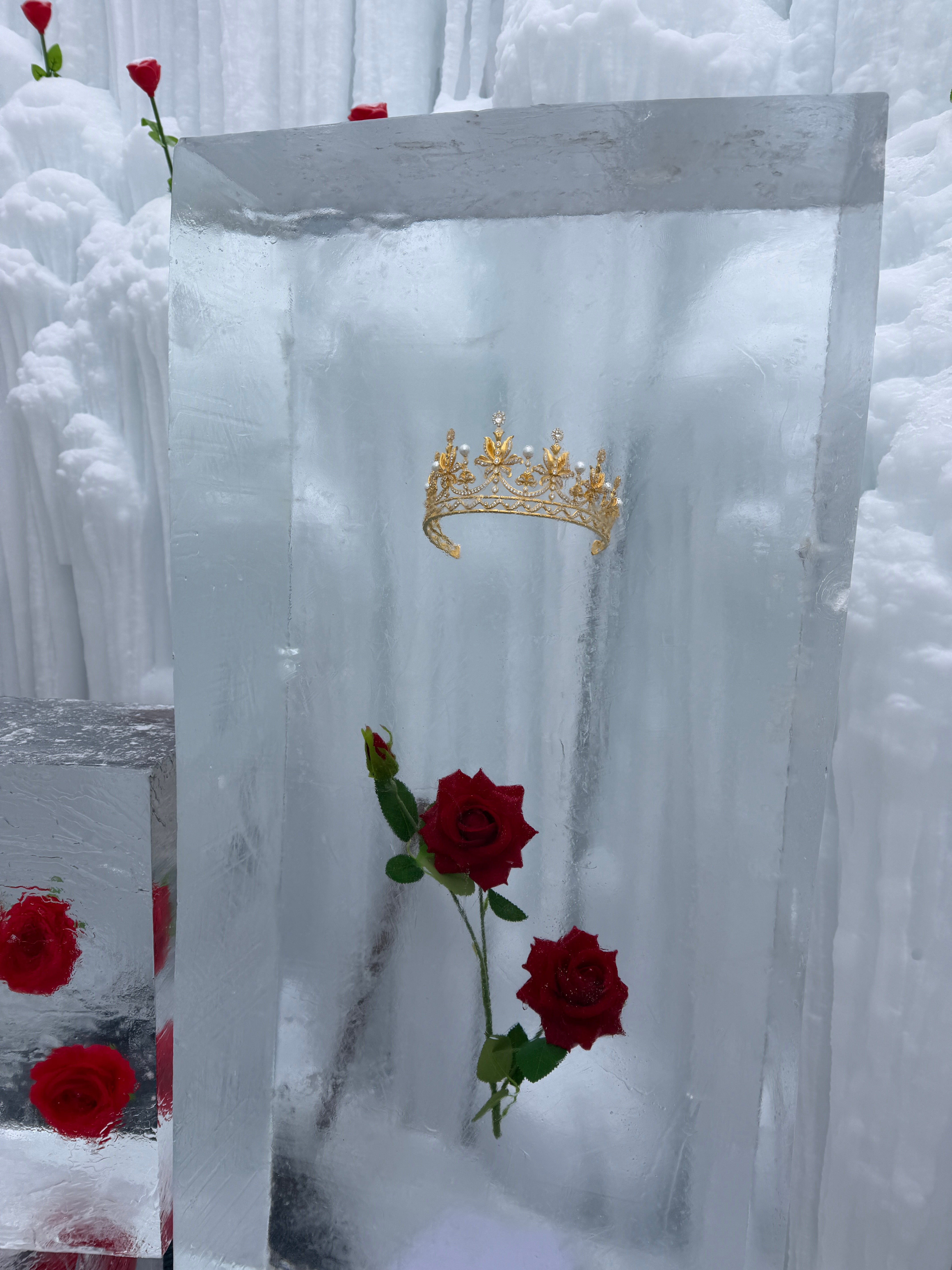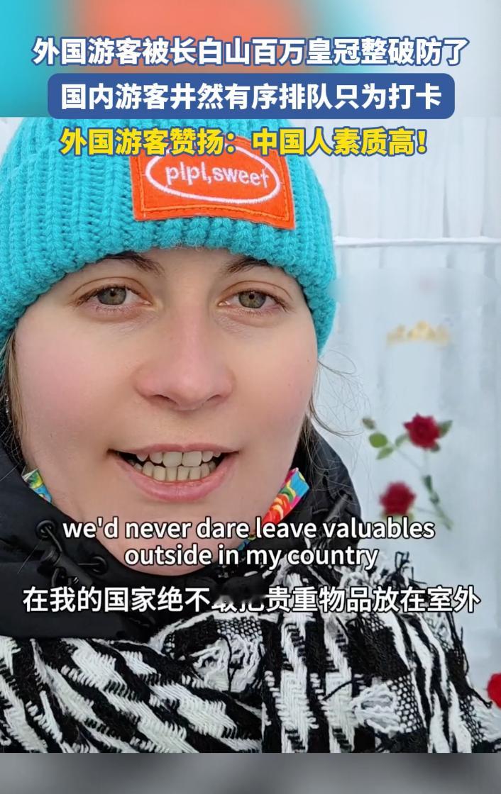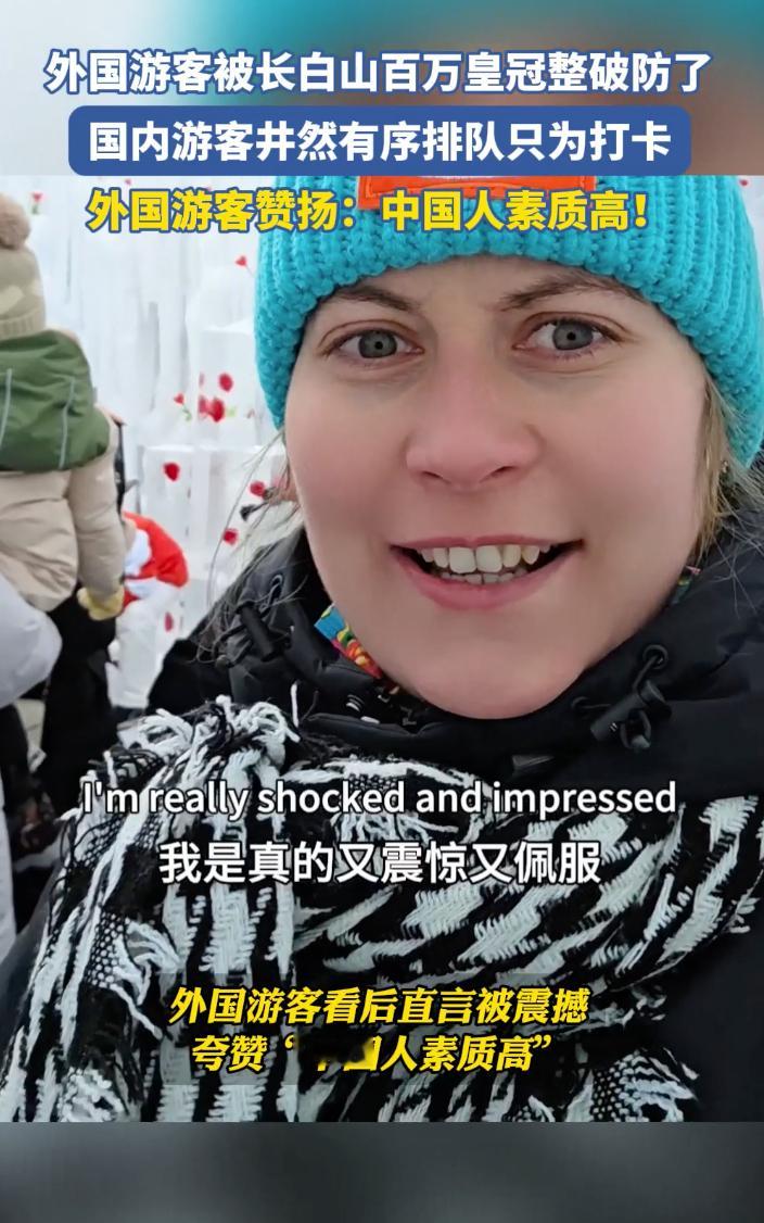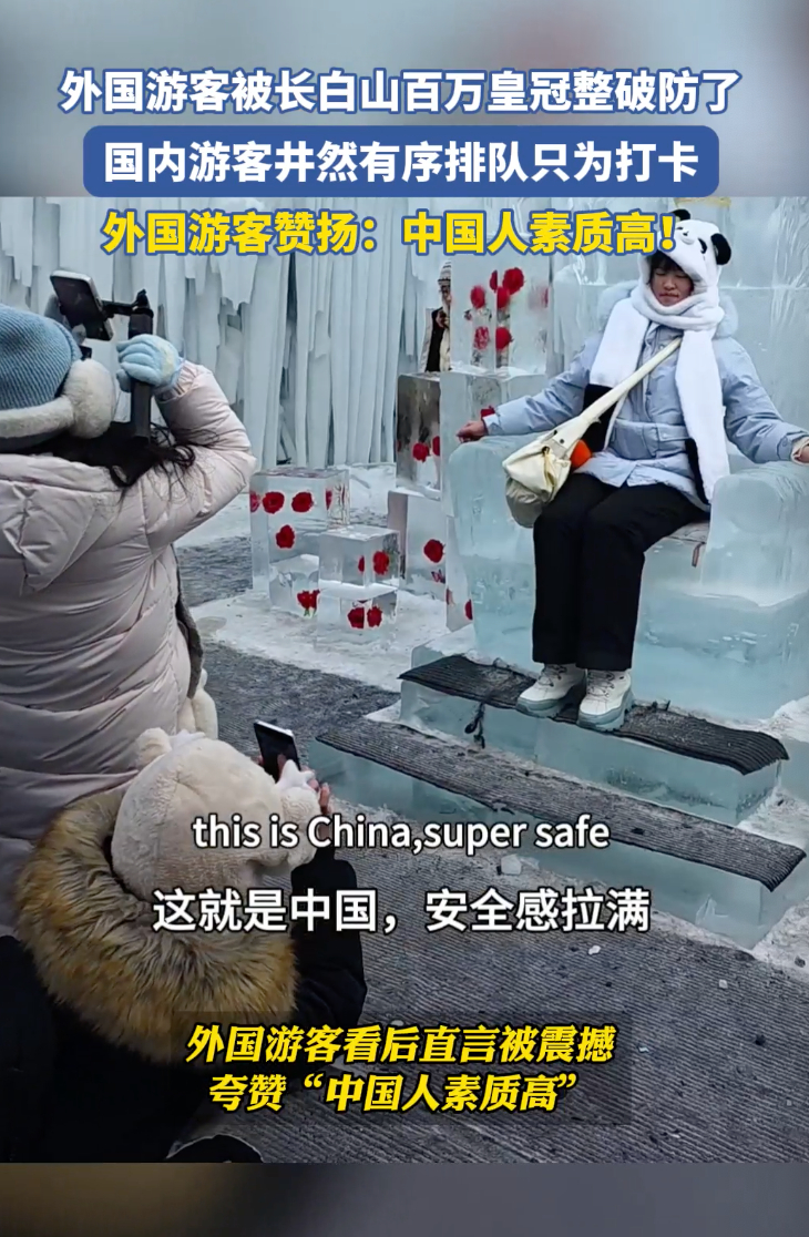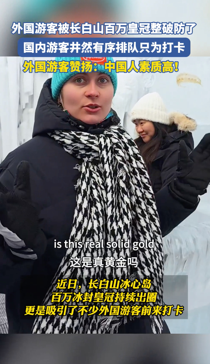 整整三顶黄金皇冠露天放置在冰雪天地之间,排队等候合影的队伍井然有序,外国游客对此景象感到十分震惊!