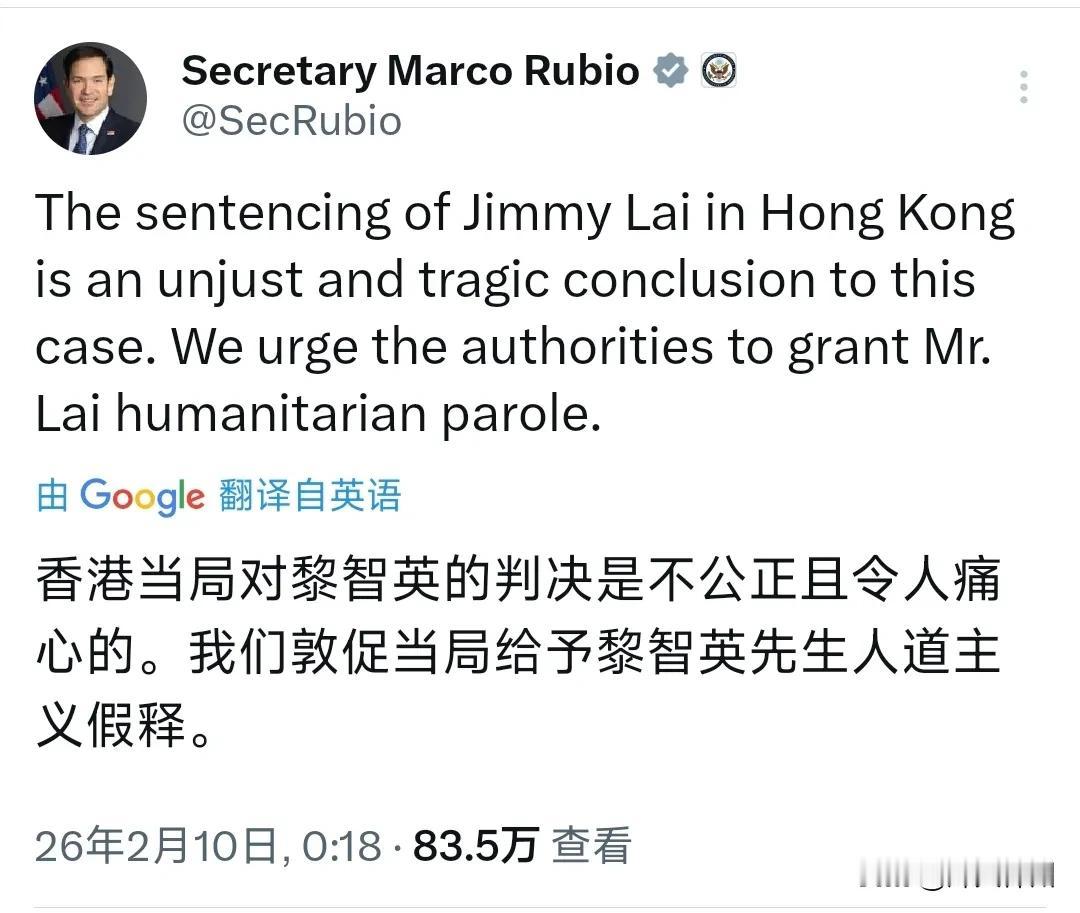 美国国务卿鲁比奥今天(北京时间2月10日)发文叫嚣道:“香港当局对黎智英的判决是