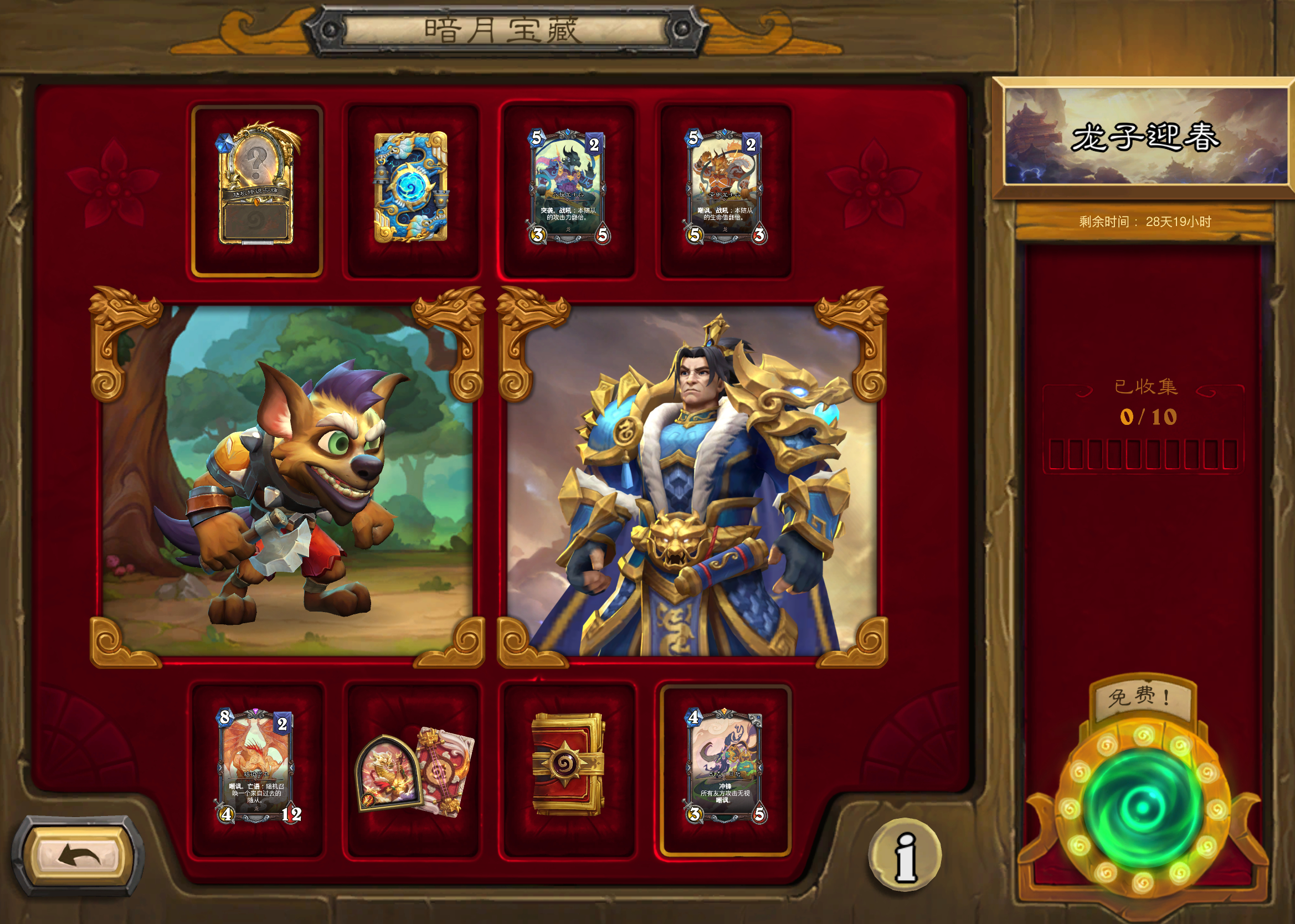 炉石传说 新大转盘已上线,此次包含两大终极大奖:霍格宠物与青龙降世瓦里安神话皮肤,以及一系列中国农历新年主题的精美奖励。你的免费一发抽到了什么?