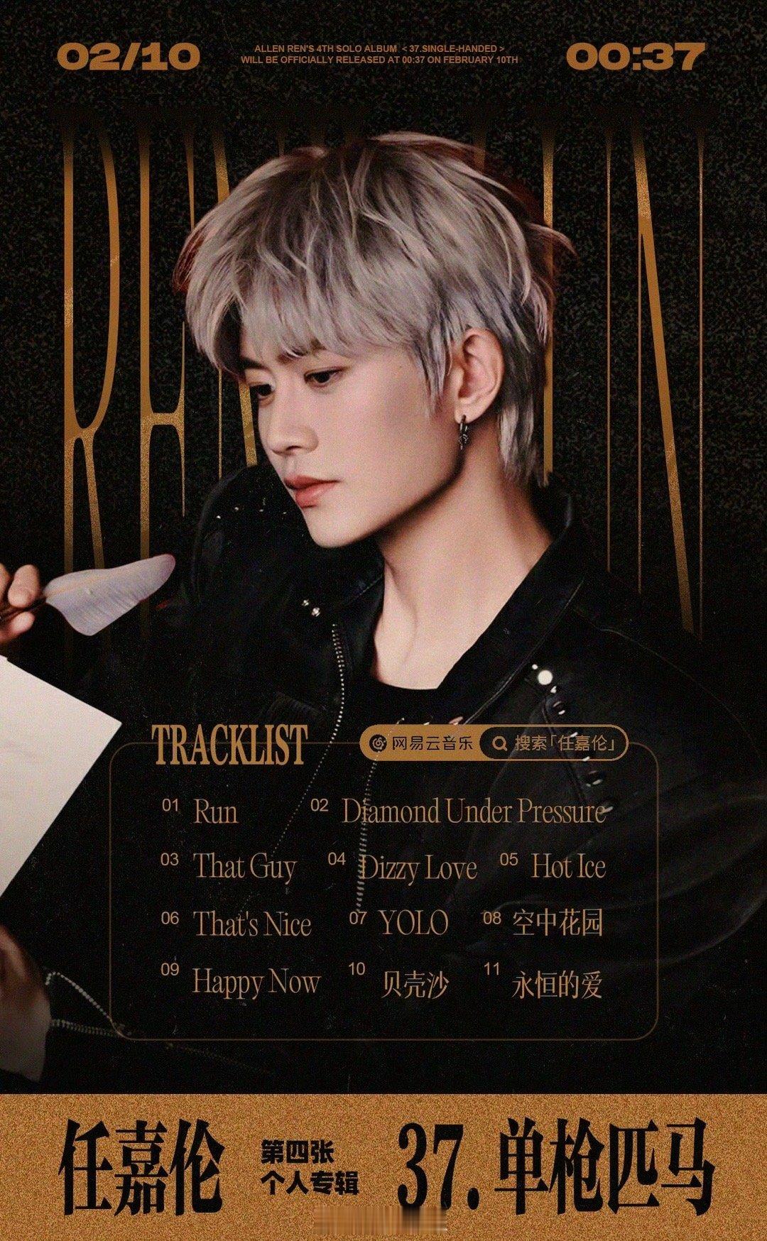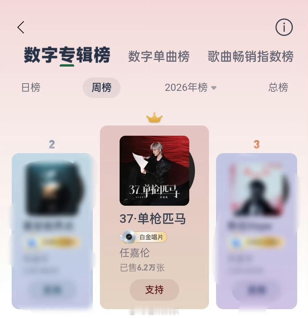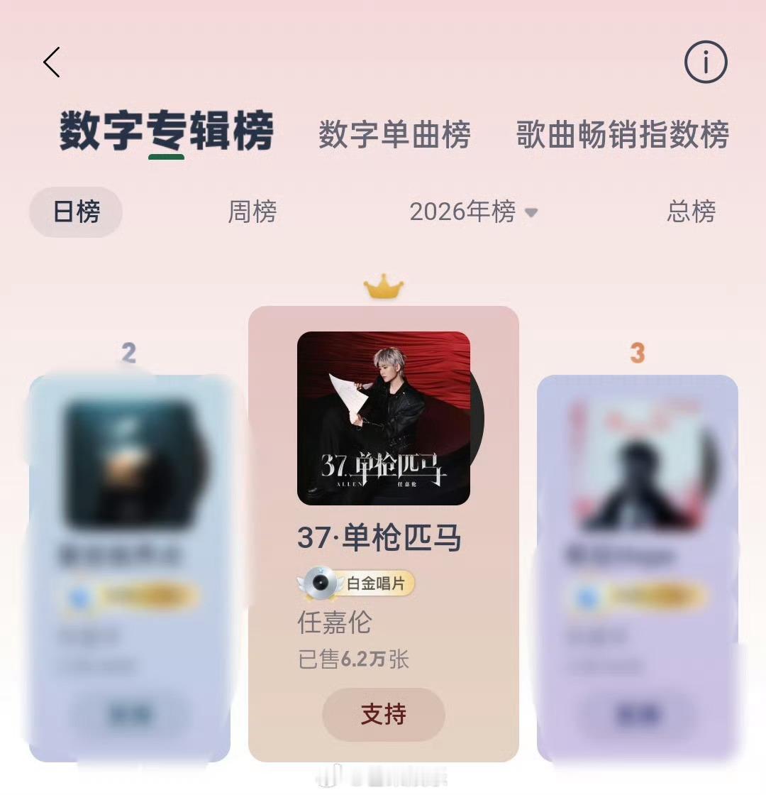 任嘉伦新专辑37单枪匹马 任嘉伦新专辑《37·单枪匹马》今日发行就拿下网易云音乐数字专辑日榜、周榜、2026年年榜TOP1!满满的用心,满满的诚意,优秀