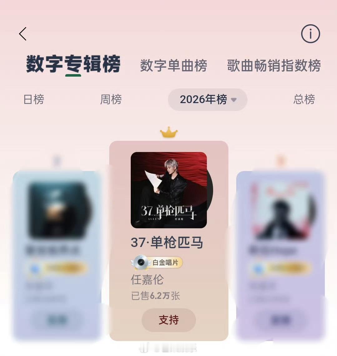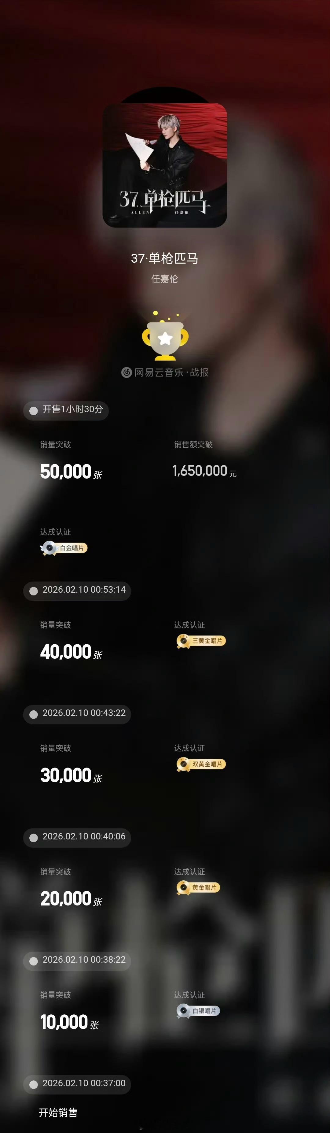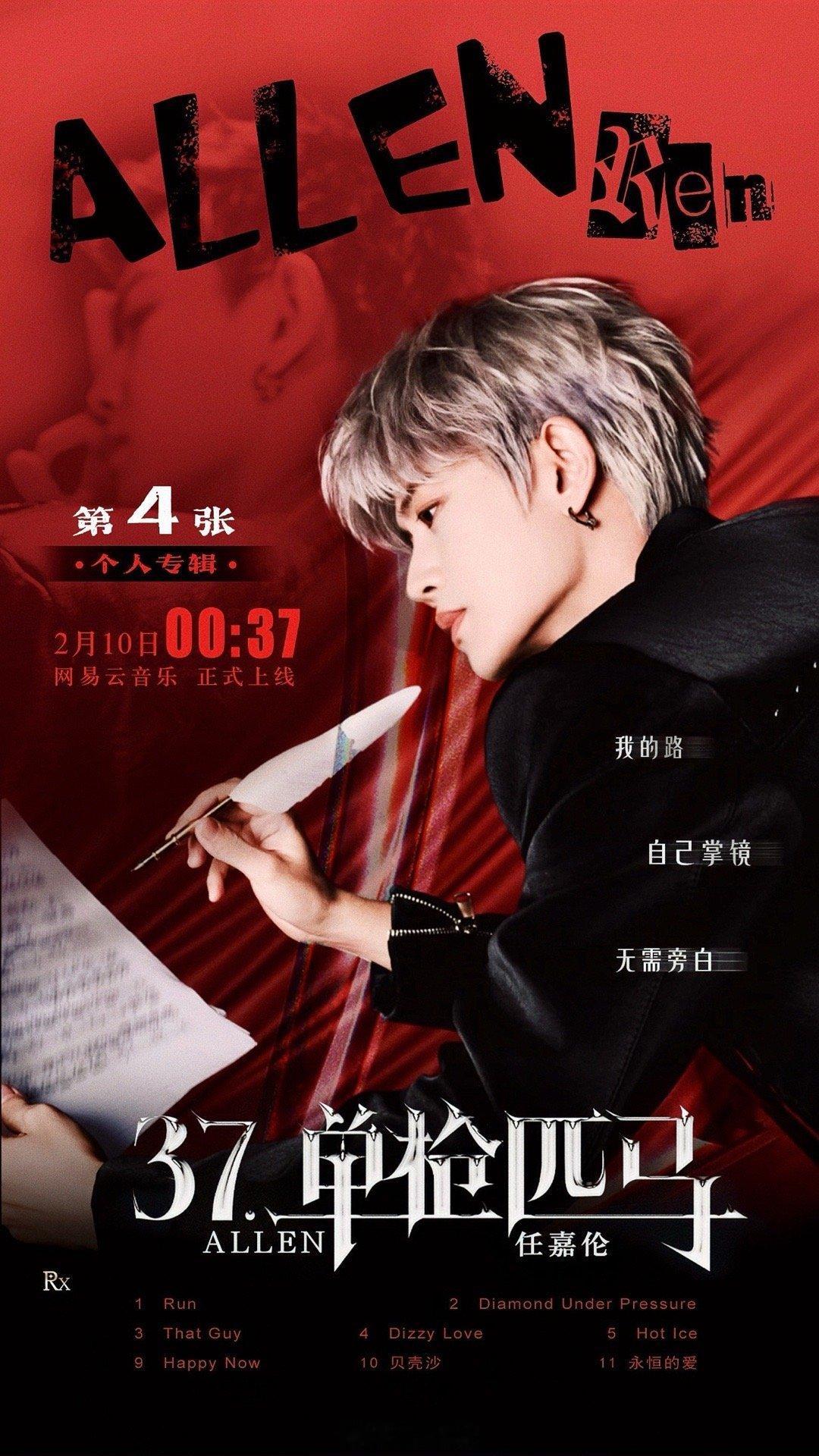 任嘉伦新专辑37单枪匹马 任嘉伦新专辑《37·单枪匹马》今日发行就拿下网易云音乐数字专辑日榜、周榜、2026年年榜TOP1!满满的用心,满满的诚意,优秀