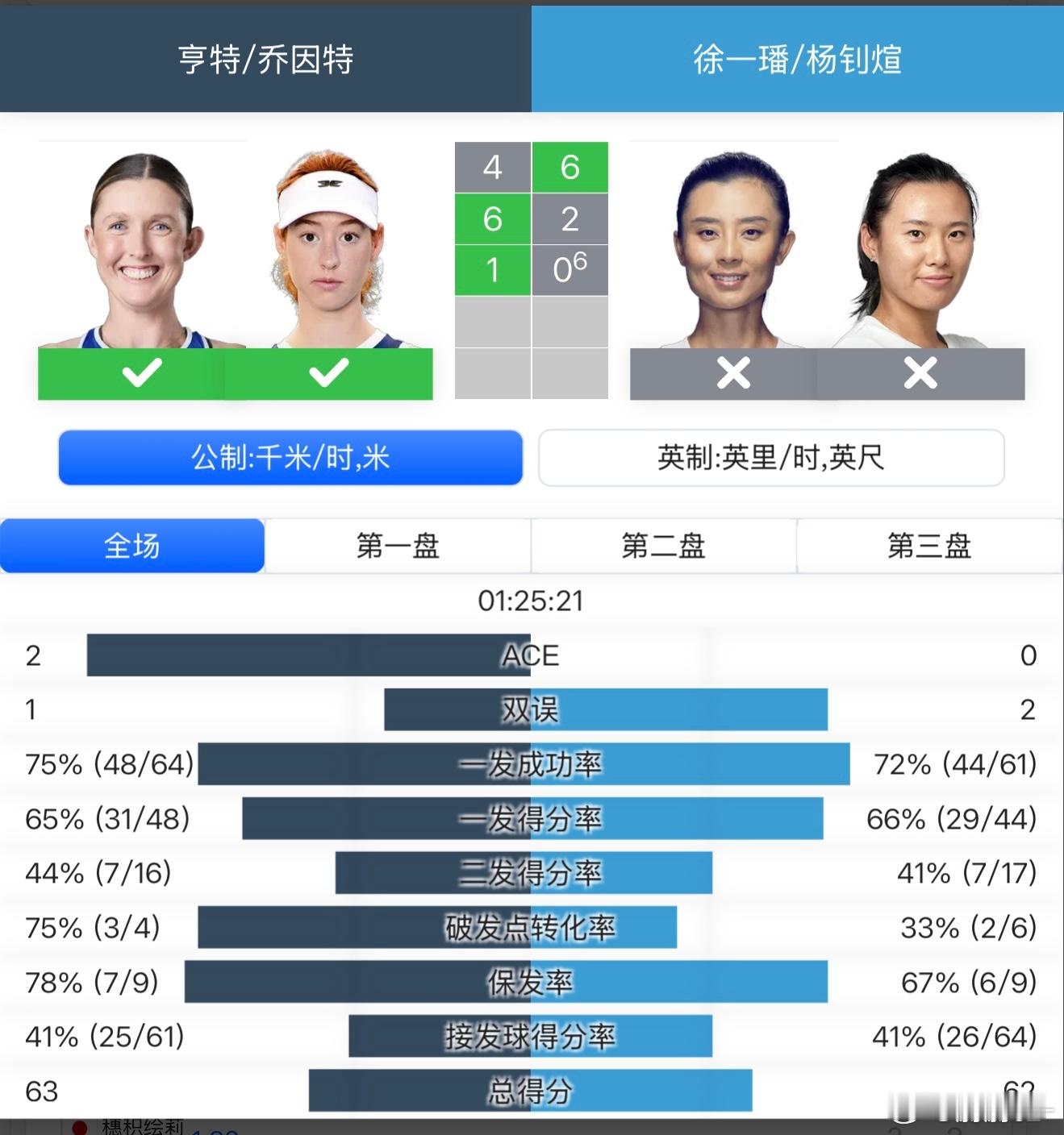 徐一璠/杨钊煊6-4/2-6/6-10遭亨特/乔恩特逆转,决胜盘抢十中未能顶住压力。开局势头超猛,可惜后程被对手抓住节奏,真的太可惜了~网球talking大会