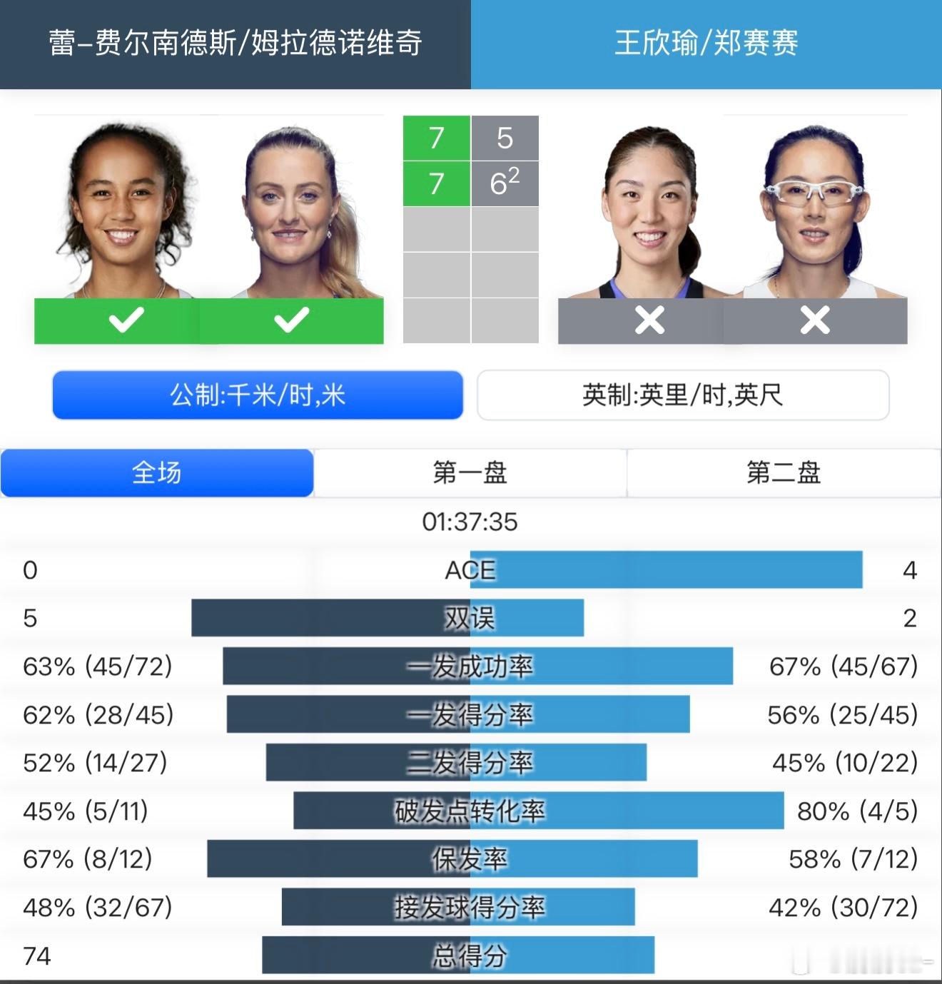 王欣瑜/郑赛赛0-2不敌费尔南德斯/穆拉德诺维奇,比分5-7/6-7(2),抢七2-7,关键分没把握住。欣瑜接下来专注单打,今晚对阵莱巴金娜,一场硬仗,加油加油!