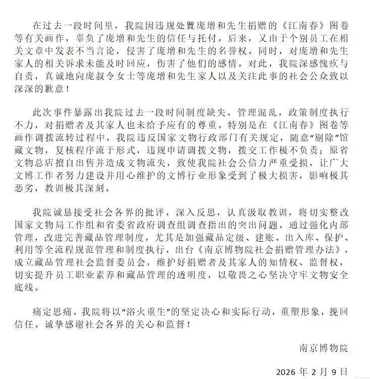 等了两个月,南京博物院终于在2026年2月9日深夜发道歉信了。 2025年12月中旬, 由庞增和先生向南京博物院捐赠的《江南春》现身拍卖市场。其后江苏文旅厅成立工作专班联合调查,但一直未对外公布调查进度。 2025年12月下旬,国家文I物局工作组到南京开展工作。 2026年2月9日深夜,南京博物院发表道歉信。 在628字的信中,南京博物院简单描述了事情的来龙去脉,对捐赠者造成的感情伤害与名誉侵害表示歉意,然后又反思在管理流程上存在的问题,最后表达洗心革面的决心。 文中除了道明捐赠者庞增和先生,未提及任何相关责任人的名字。 如果是这样的道歉信,有必要等这么久才发吗? 记录我的2026