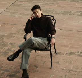 深色暗纹毛衣彰显绅士儒雅气质,灰色休闲长裤轻松自在,充满初冬的独特浪漫