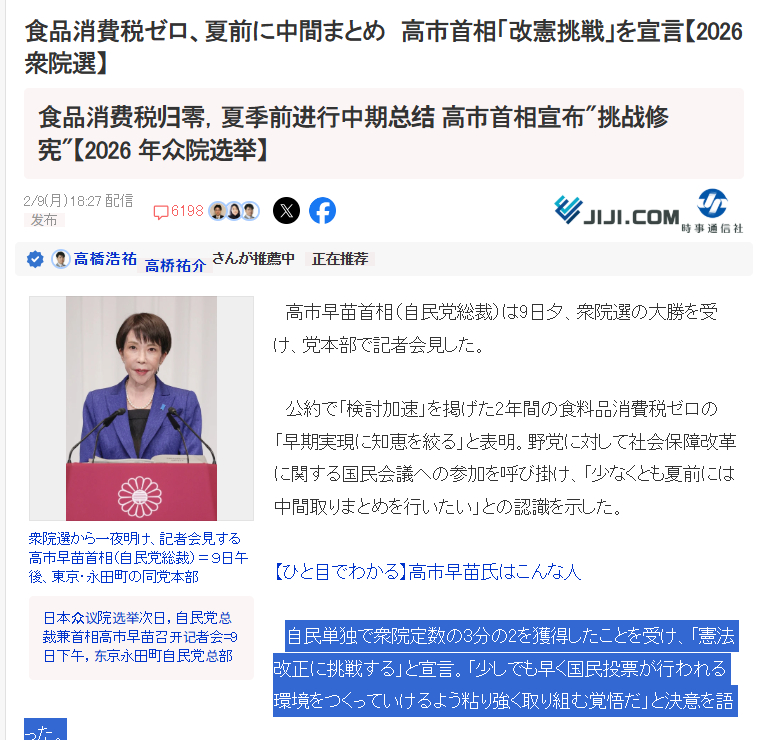 🔻老苗子宣布,“将挑战修 宪,为能尽早创造可进行日本国民投票的环境,我将坚持不懈地努力。”🔻via 时事通讯社高市赢了日本输了日本彻底右转热点现场海外新鲜事