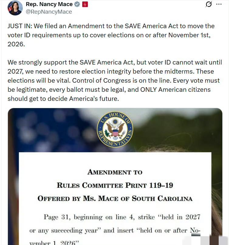 众议员南希·梅斯表示: 我们已经为《SAVE 美国法案》提交了一项修正案,将选民身份证(Voter ID)要求提前,适用于2026 年11月1日及之后的选举。 我们坚决支持《SAVE 美国法案》,但选民身份证要求不能等到2027年,我们需要在中期选举前恢复选举诚信。这些选举至关重要,国会控制权岌岌可危。 每一票都必须真实有效,每一张选票都必须合法,只有美国公民才能决定美国的未来。
