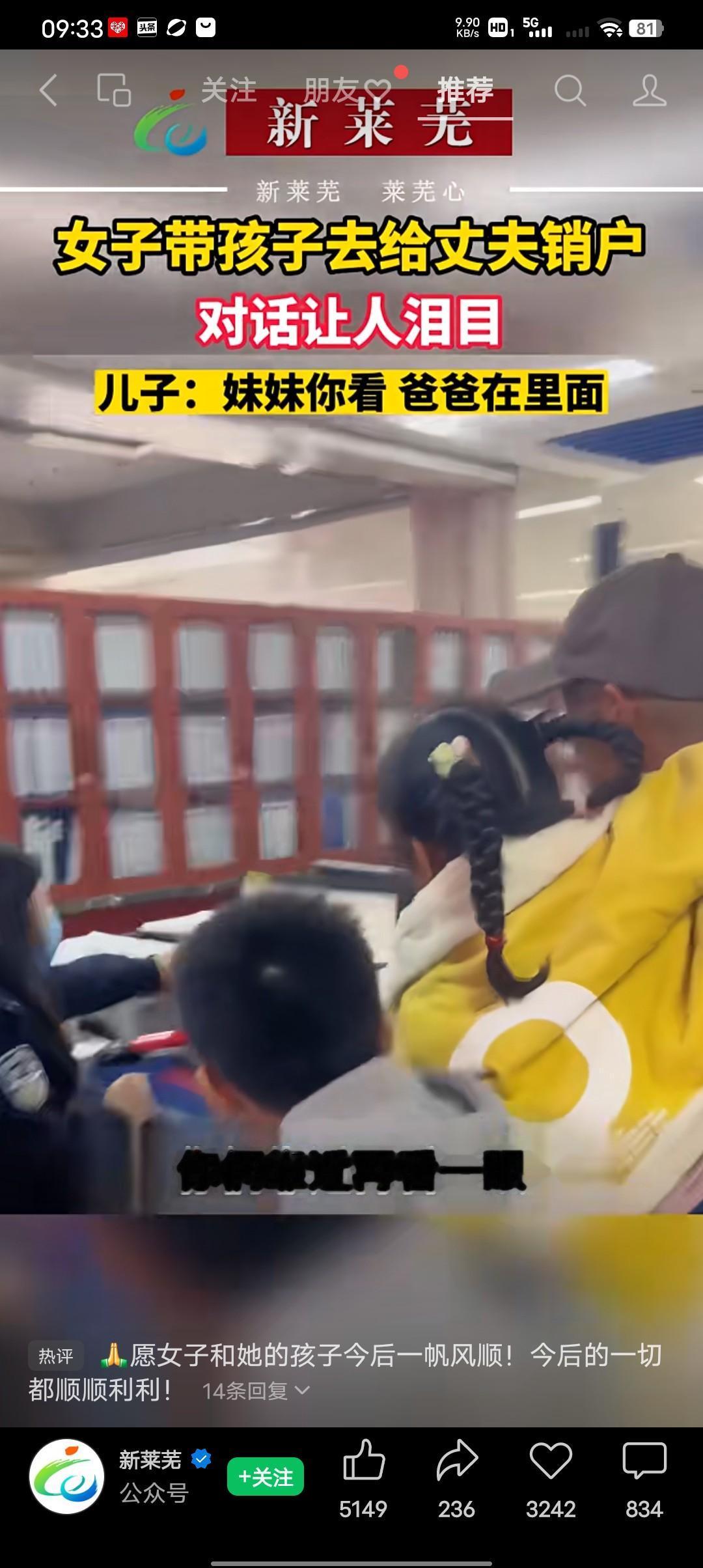 女子带孩子丈夫销户,一句“你俩靠近一点,再看一眼”瞬间让在场的人泪奔! 是啊,孩子的年纪还小什么都不懂,也许他们不知道死亡是什么在他们的意识里,你爸爸也许只是出差了,怪的时间还还会回来,他们不知道这就是永别,从此是阴阳之间的永别!他们还不知道,他们从此再也没有了爸爸,在他们的人生路上少了一个生命呵护他的人。哥哥说“妹妹,你看里面有爸爸”抱着孙女的爷爷虽然默不作声,但是从他抖动的双肩看得出他在尽量克制。 看到这个视频的网友说戴帽子的这个大爷心里最难受,因为他在承受着白发人送黑发人残忍的疼,看着儿子留下的唯一血脉,他努力的把爱转移到孩子身上,看着俩孩子就当儿子还在吧! 这世上扎人最疼的刀就是生离死别,是最爱的人,从你的世界突然的消失,你没有能力挽留,无奈跟遗憾就像一个绳子紧紧的勒,住你的脖子让你窒息,虽然你想尽一切办法,但一切都无济于事。 我也特别痛恨那种不告而别,我不是痛恨不告而别的人,只是,我觉得好不公平,为什么那种不告而别会让我们遇上呢!