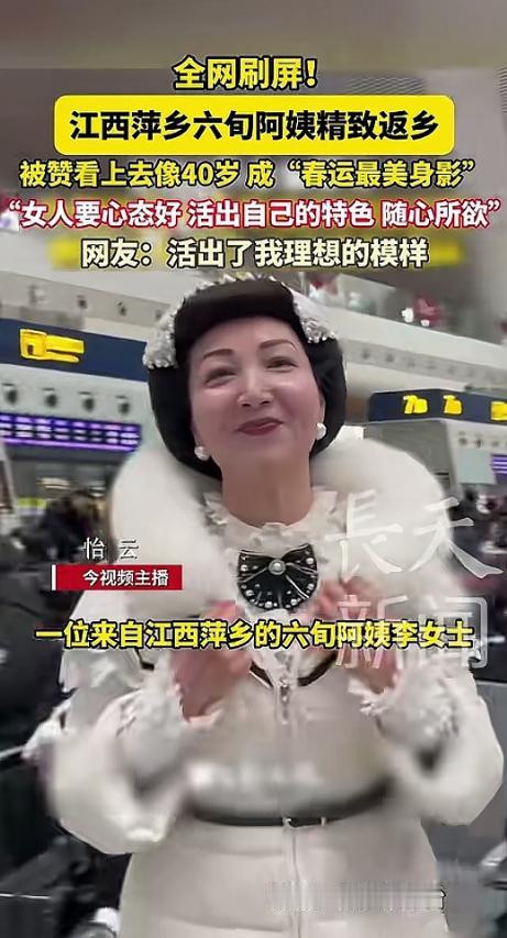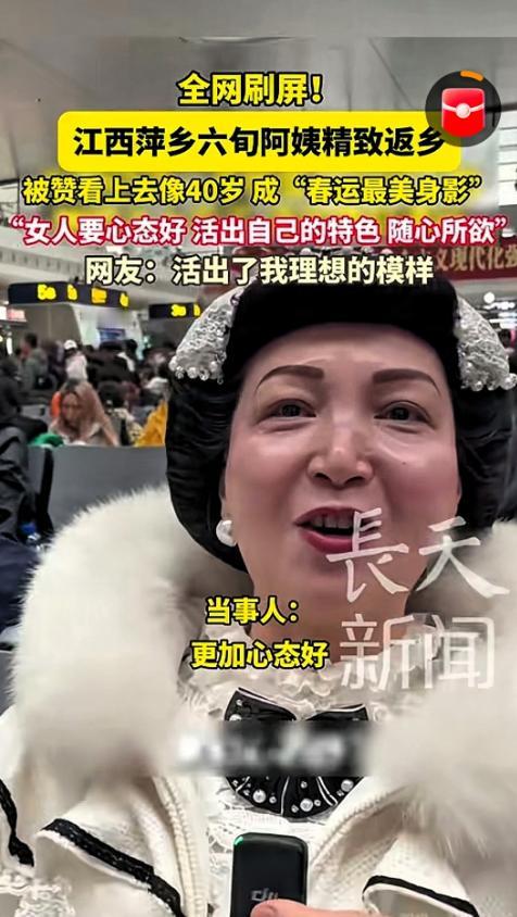 杭州东站,春运首日,一六旬阿姨精致返乡,穿戴打扮十分年轻,完全不像60多岁,被赞看起来像40岁的人,成为春运最美身影,网友:活出了我理想的模样! 2月2日,2026年春运大幕正式拉开,杭州东站作为杭州铁路主枢纽,人流如织却秩序井然,归心似箭的旅客们背着行囊、拖着行李箱,步履匆匆地奔赴各个检票口。 大多人都裹着厚实的衣物,素面朝天,只求能顺利踏上归途、早点与家人团聚,没人刻意打理模样,毕竟春运的底色,从来都是匆忙与务实。 就在这片行色匆匆的人潮里,一位阿姨的身影却意外出圈,没有夸张的装扮,没有刻意的张扬,却凭一身精致从容,成了杭州东站春运首日最动人的风景。 甚至被不少旅客误以为只有40出头,直到后来大家得知她的真实年龄,纷纷直呼不可思议。 这位阿姨来自江西,当天正准备在杭州东站乘车,返回老家与家人共度春节。 不同于身边旅客的仓促,她的打扮利落又雅致,利落的短发打理得一丝不苟,没有一丝凌乱,合身的外套衬得身姿挺拔,搭配简约又精致的配饰,不张扬却自带气质。 而且她脸上带着温和的笑意,眼神清亮,举手投足间的从容,完全褪去了六旬老人的沧桑感。 有人悄悄拍下她候车的身影,发到网上后迅速走红,网友们纷纷被这位阿姨的状态打动。 大家发现,她的精致从不是刻意凹造型,而是刻在骨子里的习惯——据悉,阿姨今年已经六十岁,孙子都十几岁了,但她坚持精致打扮几十年,衣服是自己喜欢的款式,头发也都是自己打理,从来没有因为年龄增长,就敷衍对待生活。 不同于春运里常见的疲惫与潦草,这位阿姨把返乡路也过成了自己的节奏,手里提着给家人准备的特产,从容地查看车次信息,不慌不忙,哪怕身处嘈杂的候车大厅,也始终保持着自己的格调。 她没有觉得“年纪大了,没必要打扮”,反而觉得,女人无论到了什么年纪,都要有爱美的心,要活出自己的特色。 她的新年心愿也格外朴实动人,不追求荣华富贵,只盼着自己和家人身体健康,也希望每个人都能保持年轻的心态,不被年龄束缚,这份通透与热爱,戳中了无数网友的心。 评论区里,网友们纷纷留言感慨:“这才是我理想中的晚年模样”“六十岁能活成这样,太让人羡慕了”“精致从来与年龄无关,是对生活的热爱”。 有人说,春运里的大多身影都带着奔波的疲惫,而这位阿姨却用自己的状态告诉大家,无论身处何种境遇,无论多大年纪,都能把日子过成自己喜欢的样子。 其实春运最美的身影,从来都不只是惊天动地的壮举,也可以是这样平凡却耀眼的瞬间。 这位六旬阿姨没有惊艳四座的容貌,却用刻在骨子里的精致与从容,打破了人们对老年人的固有认知,在匆匆返乡路上,活成了一束光,也给每一位奔波的游子,注入了热爱生活的力量。