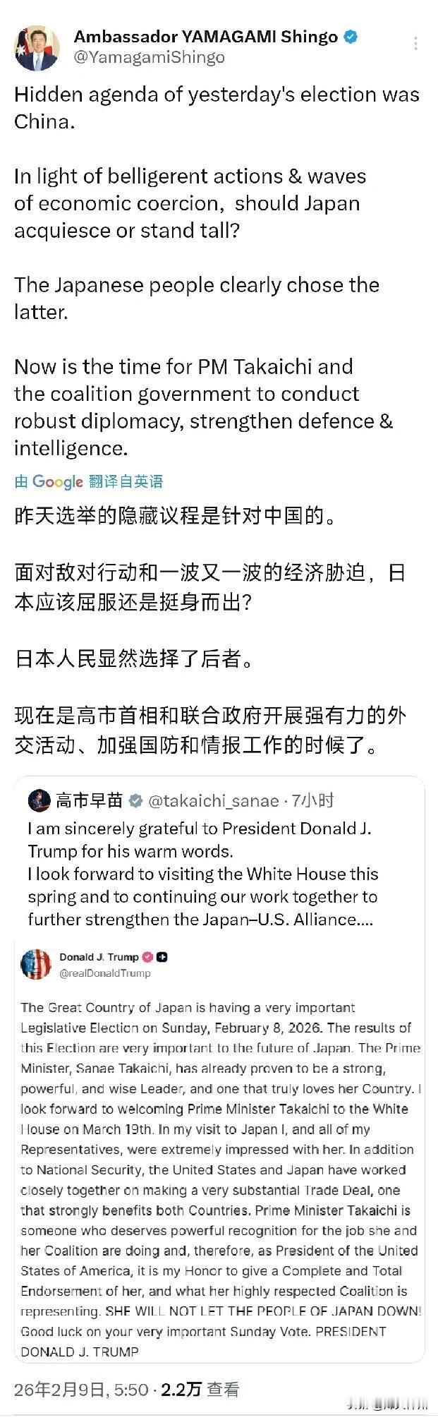 日本驻澳大利亚大使山上信吾今天(2月9日)发文写道:“昨天选举的隐藏议程是针对中国的。面对敌对行动和一波又一波的经济胁迫,日本应该屈服还是挺身而出?日本人民显然选择了后者。现在是高市首相和联合政府开展强有力的外交活动,加强国防和情报工作的时候了。”【山上信吾还转发了高市早苗感谢特朗普的发文。】 评几句: 外交不该渲染对抗,地区稳定才是大势所趋 日本驻澳大利亚大使近期发表的言论,把国内选举和对外对立强行捆绑,刻意渲染对抗氛围,不仅偏离外交本职,更在地区制造不必要的紧张。 各国选举,本该聚焦民生冷暖、聚焦发展大局,而不是靠制造对立、挑动矛盾来博取关注。把内部政治绑上对抗战车,既不负责任,也不得人心。 所谓“经济胁迫”的说法,完全与事实相悖,本质上是抹黑与误导。 驻外使节的真正使命,是搭桥铺路、增进互信,而不是激化矛盾、破坏大局。 中国始终站在和平与合作一边,坚持相互尊重、和平共处、合作共赢。 冷战思维早已过时,拉帮结伙搞对抗,从来都没有未来。 和平才是人心所向,合作才是时代主流。 任何挑动对立、制造冲突的做法,最终只会反噬自身。 你觉得,世界需要的是对抗,还是合作?评论区说说你的看法。