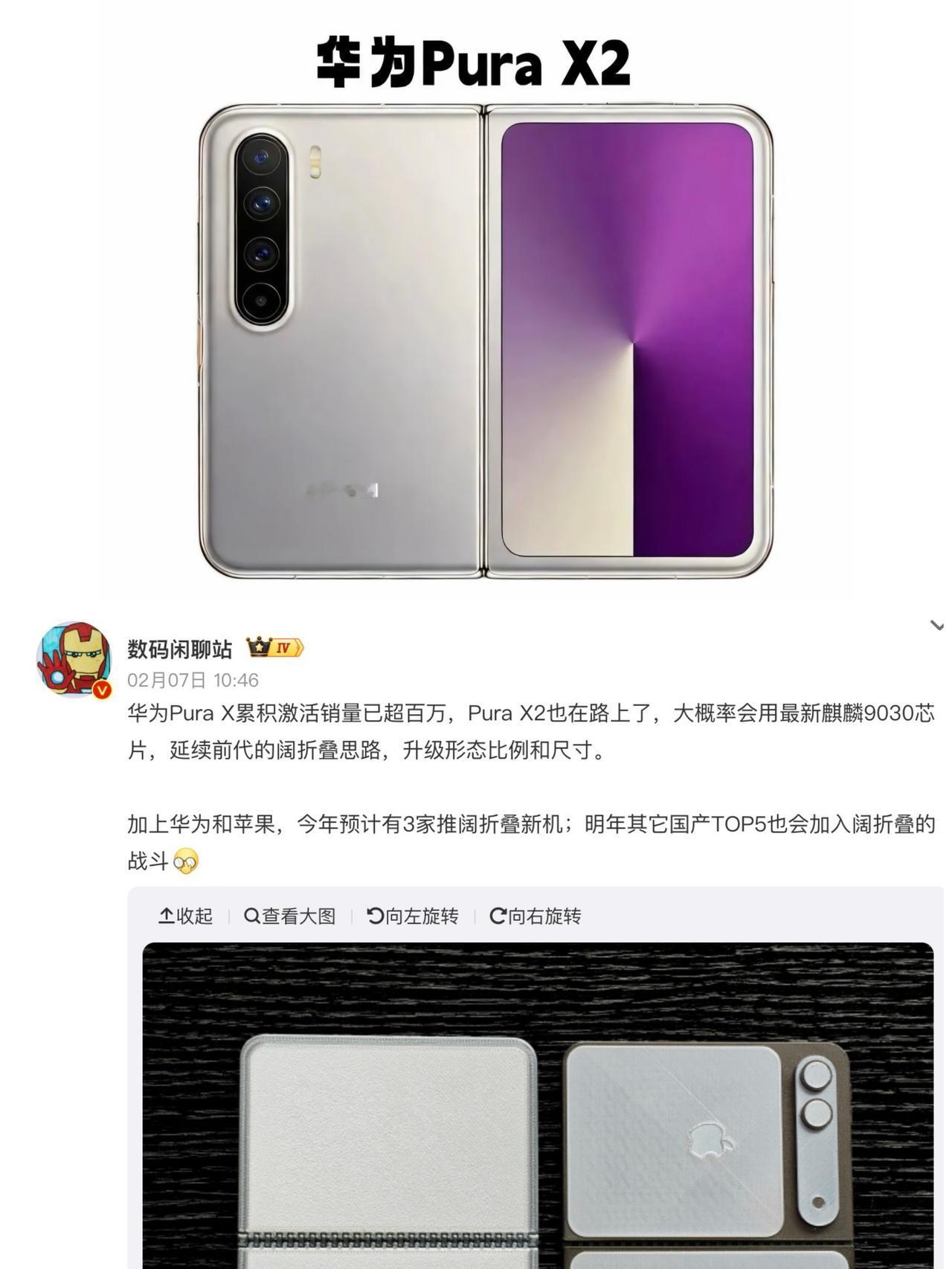 阔折叠成潮流了?华为Pura X2正面刚苹果 还得是华为啊! 站哥刚刚爆料,华为Pura X 阔折叠的累积激活销量已超百万,二代机型 Pura X2 也在路上,听说是延迟到4月上了🤔 而且从配置来看,这回变化还挺大的 👉改成翻书折叠方式 👉7.69英寸内屏,5.5英寸外屏 👉升级9030芯片 🍎对比之下,苹果折叠屏也是一个小胖子阔折叠...不过得9月才上,起售价或超💰1.3万,你站谁?