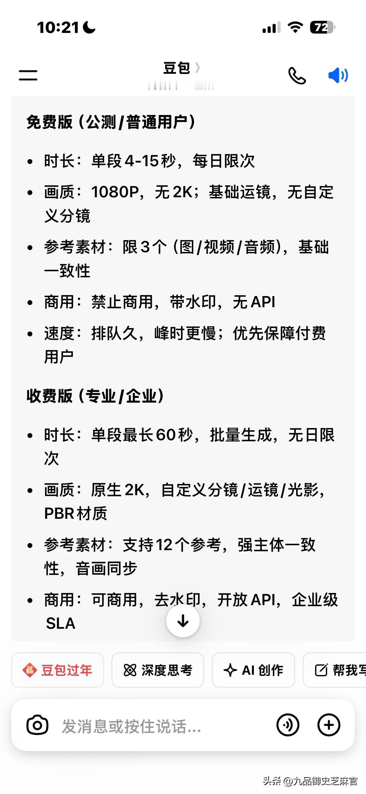 别再芒吹Seedance 2.0了行吗?:这几个关键点为啥都不提? 其实官方发布模型,用点必要营销手段很正常,找些大v搞搞推流也不错,一些自媒体蹭个热度也理解,可能唠点实话吗?吹了半天,底层关键点一点不提?这是豆包自己总结的seedance2.0收费/免费区别,指望一个工具改变人生的可以先看看。附图我是用免费版给的体验次数+高指令描述词:生成的视频截图,你可以看看符合你的预期不。 收费版(专业/企业) • 时长:单段最长60秒,批量生成,无日限次 • 画质:原生2K,自定义分镜/运镜/光影,PBR材质 • 参考素材:支持12个参考,强主体一致性,音画同步 • 商用:可商用,去水印,开放API,企业级SLA • 速度:专属算力,低排队,峰时优先调度 关键补充 • 免费版是体验窗口,核心生产力功能只在收费版 • 公测期规则可能调整,以即梦平台公告为准 我从不拦着别人的致富梦,只是希望钱花在关键点,你兴致冲冲投钱往里冲,就怕空欢喜一场。此篇只为了揭露许多宣传视频刻意回避内容,具体ai视频壁垒不过多叙述。普通人如何借AI创业