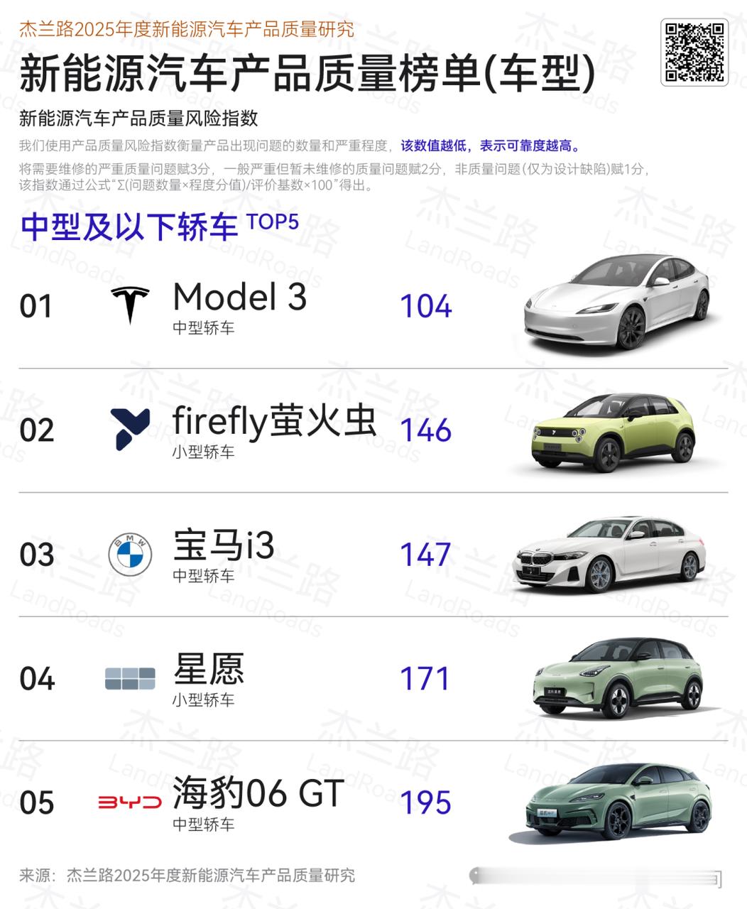 近日,汽车行业咨询公司杰兰路发布《2025年度新能源车产品质量研究》,以“产品质量风险指数”来衡量车辆出现问题的数量及严重程度,数值越低,表示产品可靠度越高。