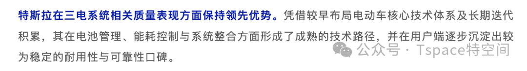 报告分析指出,凭借在核心技术上的早期布局与持续迭代,特斯拉在电池管理、能耗控制和系统整合等方面已形成成熟的技术路径,这让产品在用户端逐步建立起良好的耐用性与可靠性口碑。