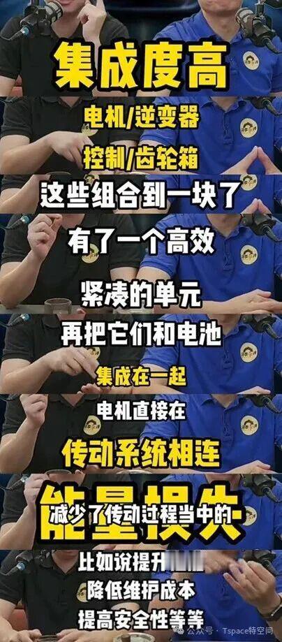 博主何李车评 进一步解读称,特斯拉将电机、逆变器、控制单元和齿轮箱整合为一个紧凑单元,并与传动系统直接相连。