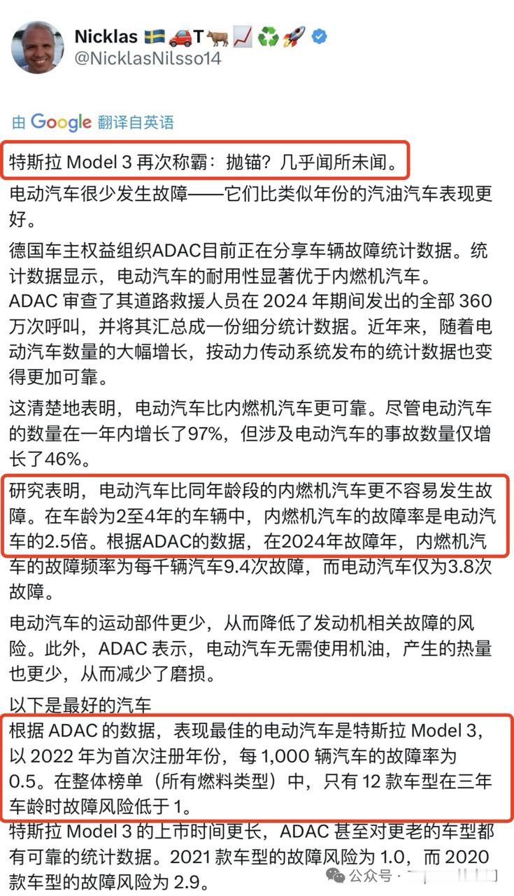 特斯拉稳定可靠的产品质量,在多个国家的权威机构调研中均得到进一步验证。全德汽车俱乐部(ADAC)在一项涵盖360万次道路救援呼叫的统计分析中发现,电动车的整体耐用性显著优于燃油车,而Model 3更是以每千辆故障率仅0.5的成绩,成为所有乘用车中故障率最低的车型。