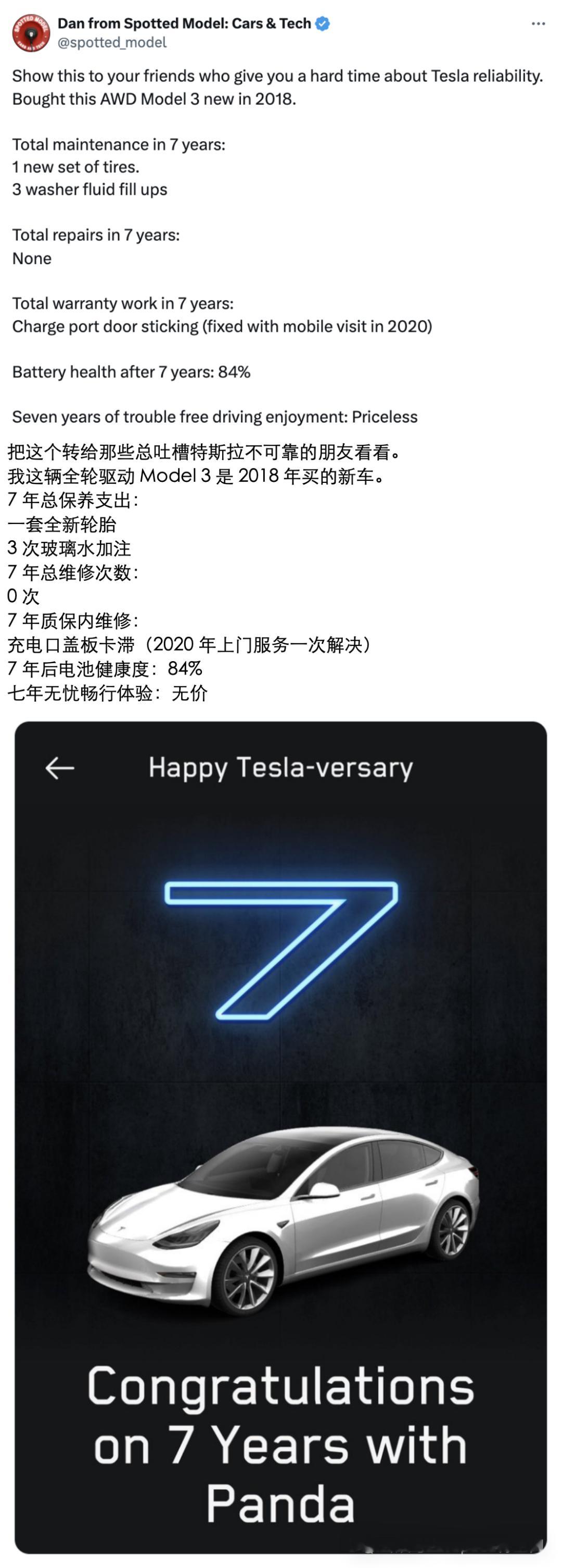 Model 3车主spotted_model 则分享出自己七年的用车经历:期间仅更换过一次轮胎、加注过三次玻璃水,除此之外几乎没有任何故障维修。即便行驶多年,车辆电池健康度仍保持在84%。