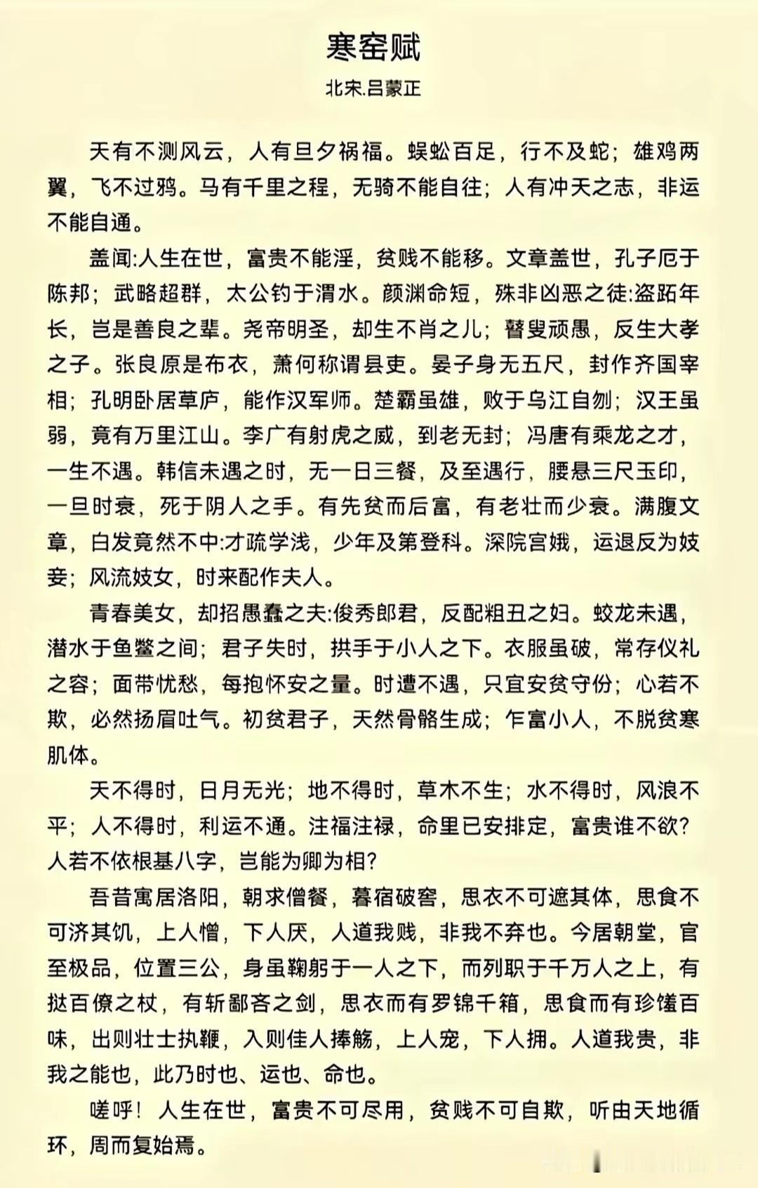 寒窑赋(目前主流学界认为,《寒窑赋》并非吕蒙正的亲笔原作,更可能是明清时期的民间文人托名所作) 北宋·吕蒙正(北宋初年名臣,曾三度拜相,以正直敢言、宽宏大量著称) 天有不测风云,人有旦夕祸福。蜈蚣百足,行不及蛇;雄鸡两翼,飞不过鸦。马有千里之程,无骑不能自往;人有冲天之志,非运不能自通。 盖闻:人生在世,富贵不能淫,贫贱不能移。文章盖世,孔子厄于陈邦;武略超群,太公钓于渭水。颜渊命短,殊非凶恶之徒:盗跖年长,岂是善良之辈。尧帝明圣,却生不肖之儿;瞽叟顽愚,反生大孝之子。张良原是布衣,萧何称谓县吏。晏子身无五尺,封作齐国宰相;孔明卧居草庐,能作汉军师。楚霸虽雄,败于乌江自刎;汉王虽弱,竟有万里江山。李广有射虎之威,到老无封;冯唐有乘龙之才,一生不遇。韩信未遇之时,无一日三餐,及至遇行,腰悬三尺玉印,一旦时衰,死于阴人之手。有先贫而后富,有老壮而少衰。满腹文章,白发竟然不中:才疏学浅,少年及第登科。深院宫娥,运退反为妓 妾;风流妓 女,时来配作夫人。 青春美女,却招愚蠢之夫:俊秀郎君,反配粗丑之妇。蛟龙未遇,潜水于鱼鳖之间;君子失时,拱手于小人之下。衣服虽破,常存仪礼之容;面带忧愁,每抱怀安之量。时遭不遇,只宜安贫守份;心若不欺,必然扬眉吐气。初贫君子,天然骨骼生成;乍富小人,不脱贫寒肌体。 天不得时,日月无光;地不得时,草木不生;水不得时,风浪不平;人不得时,利运不通。注福注禄,命里已安排定,富贵谁不欲?人若不依根基八字,岂能为卿为相? 吾昔寓居洛阳,朝求僧餐,暮宿破窖,思衣不可遮其体,思食不可济其饥,上人憎,下人厌,人道我贱,非我不弃也。今居朝堂,官至极品,位置三公,身虽鞠躬于一人之下,而列职于千万人之上,有挞百僚之杖,有斩鄙吝之剑,思衣而有罗锦千箱,思食而有珍馐百味,出则壮士执鞭,入则佳人捧觞,上人宠,下人拥。人道我贵,非我之能也,此乃时也、运也、命也。 嗟呼!人生在世,富贵不可尽用,贫贱不可自欺,听由天地循环,周而复始焉。 这篇文章并非宣扬消极的宿命论,而是一种清醒的人生智慧!