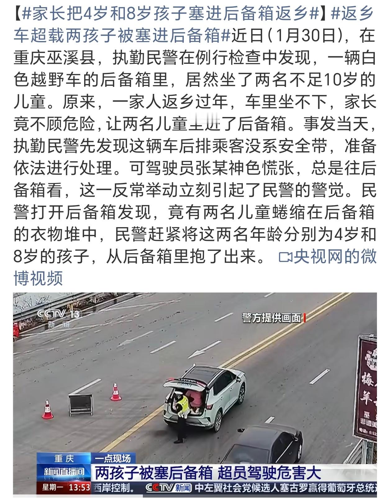 家长把4岁和8岁孩子塞进后备箱返乡只能说家长心是真的大,不过也能看出我们中国人归家的心切。春运了,无论是开车还是坐高铁回家的朋友都注意安全,平安到家!