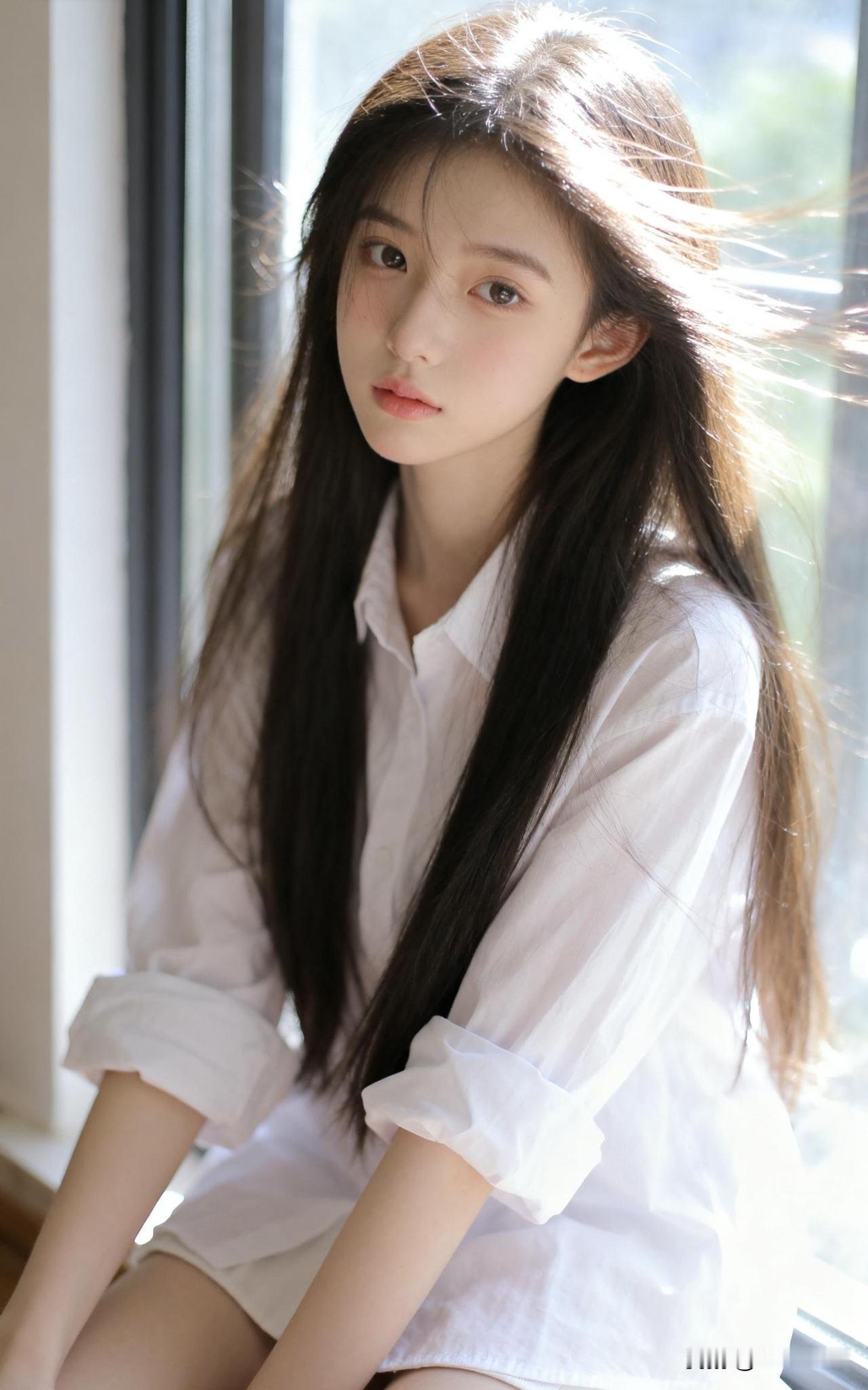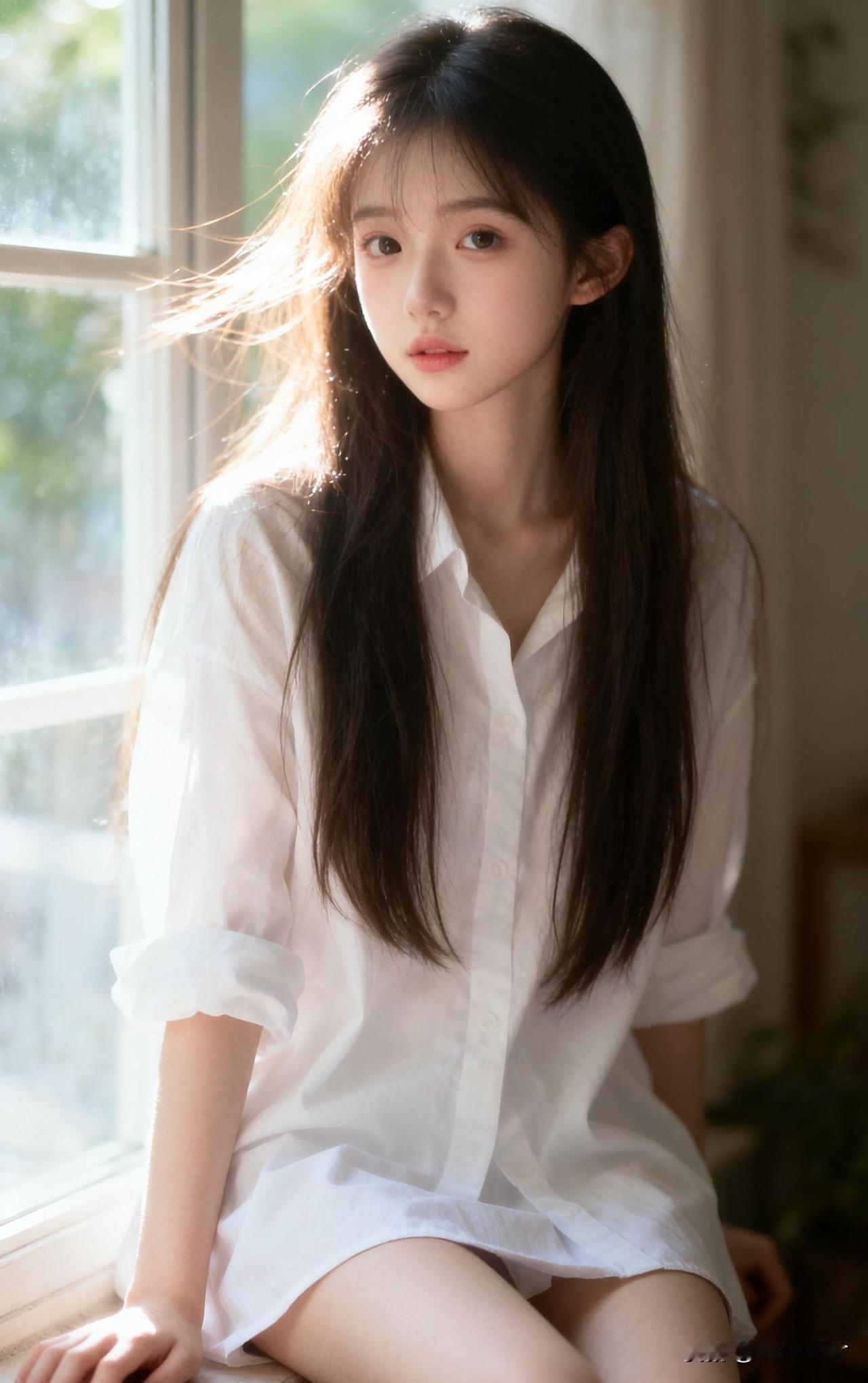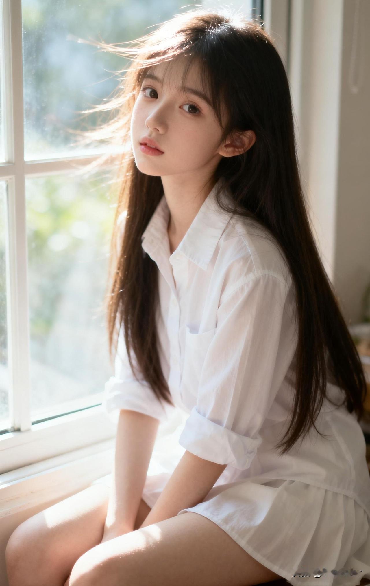 阳光洒进来的午后,少女静坐窗边,微风轻拂发梢,宁静而美好。