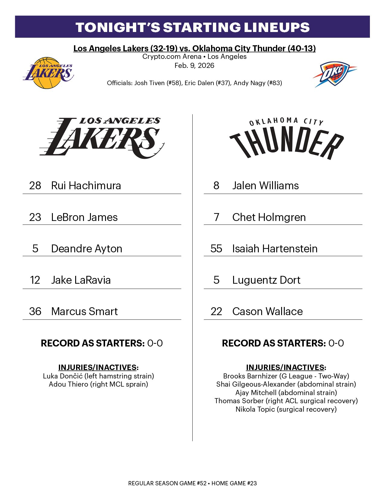 背靠背第一场打雷霆,湖人首发:詹姆斯,斯玛特,拉拉维亚,八村塁,艾顿
