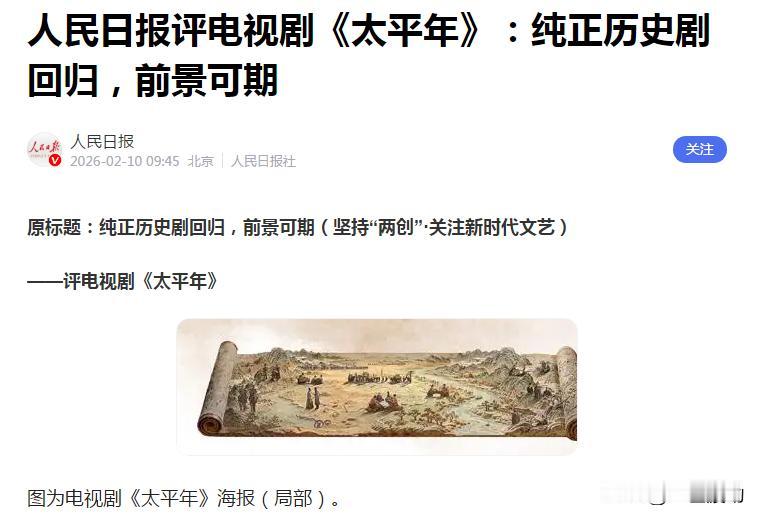 《太平年》开了一个好头,但愿不是结束。 千呼万唤始出来,历史正剧又迎来春天,这就是央视对本剧的评价。 实在难得很,能够认真的讲述历史,用严格的眼光来审视历史,在近些年灿若星河的古装剧中,能够获得众多赞誉,的确是一匹大黑马。 对比近几年的古装作品,《太平年》没有架空,没有后宫,没有穿越,没有戏说,真真切切的围绕史料,以图真实的还原真实。 想拍这样的电视剧,当下来讲要冒很大风险,因为它抛弃了女性市场,抛弃了帅哥美女式的爱情古装剧。 近几年的后宫剧和架空剧,把观众都要看吐了,每个剧都像是穿着古装的爱情剧,拍摄这种剧能少费不少力气,想像力足够就可完成,不用在乎什么历史真实性。 历史正剧被制片和观众双方冷落,极容易吃力不讨好,也会失去一大部分家庭主妇的青睐。 但是到现在为止,《太平年》的号召力还很强劲,其评价一路走高,仿佛又看到了《大秦帝国之崛起》的盛况。 观众是能够吃细粮的,只要做的足够好。