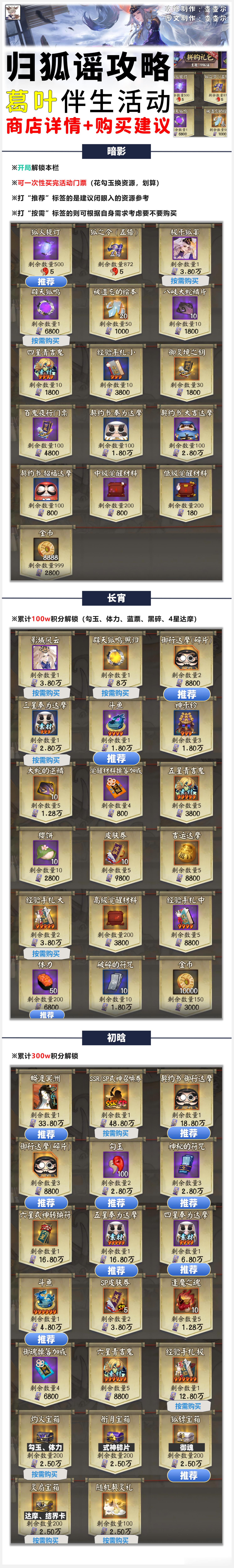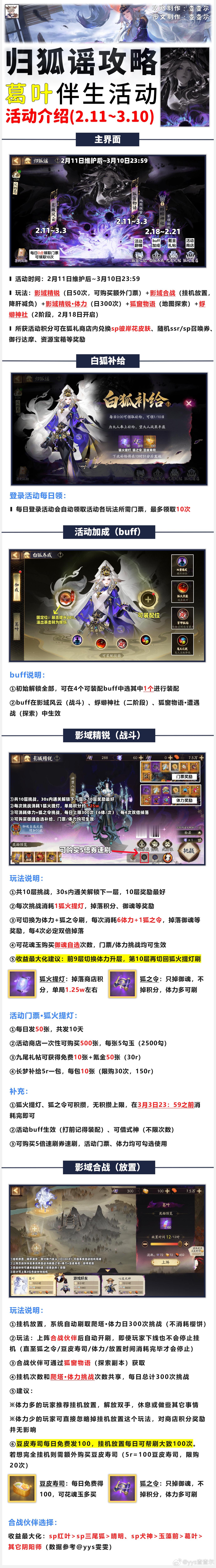阴阳师手游马上游福微博开新年超话创作官 【归狐谣】葛叶活动,6图攻略+8套阵容+御魂自选建议■活动2.11开启,共4个玩法,一阶段需要做2套阵容■爬塔+挂机放置+探索+二阶段■一阶段收益统计在图二最后一个板块中有计算说明■挂机放置可以理解为是把每日体力挑战300次的活交给系统,它自动帮你刷了。■放置收益略低于你自己手动打,有时间可以自己手动刷日300次,没时间就交给挂机放置(完全挂满需购买豆皮寿司道具增加次数)
