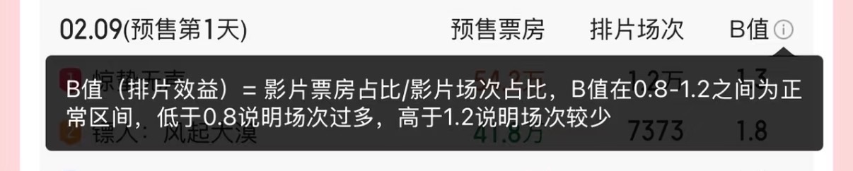 《星河入梦》B值目前最高,B值是指排片效益,0.8-1.2是一个正常值,低于0.8说明排片场次过多,高于1.2说明排片过少,目前影片的粉丝们冲预售很给力,把影片的B值直接冲到了2.0,出现了影片排片供不应求的情况!春节档马上有戏2026春节档抢先看