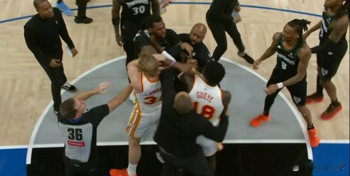 今天是打架日!北京时间2月10日,NBA常规赛爆发多起群殴事件,继活塞黄蜂比赛中四人混战被驱逐后,森林狼对阵老鹰比赛中,两队球员里德和盖耶也因为冲突被双双驱逐,给比赛增添了浓厚的火药味。 比赛第三节,盖耶在卡位中直接发力将里德推翻,里德起身后直接冲向盖耶贴面喷垃圾话,两人经过短暂的言语输出怒气上升,伸手互相拉拽对方球衣开始推搡。此时裁判和双方工作人员一拥而上试图劝解,结果反而激发了双方的怒火,里德与盖耶动作越来越大,根本无视旁人的劝阻扭打在一起,瞬间十几个人搅成一团,场面极其混乱。 最终在众人合力下冲突被平息,里德和盖耶毫无悬念地被双双驱逐,而全程奋力劝架的老鹰中锋兰代尔脖子被抓出三道又长又深的血痕,看起来触目惊心,他的伤痕成为这次冲突激烈程度的注脚。NBA吐槽大会 里德盖耶被双双驱逐