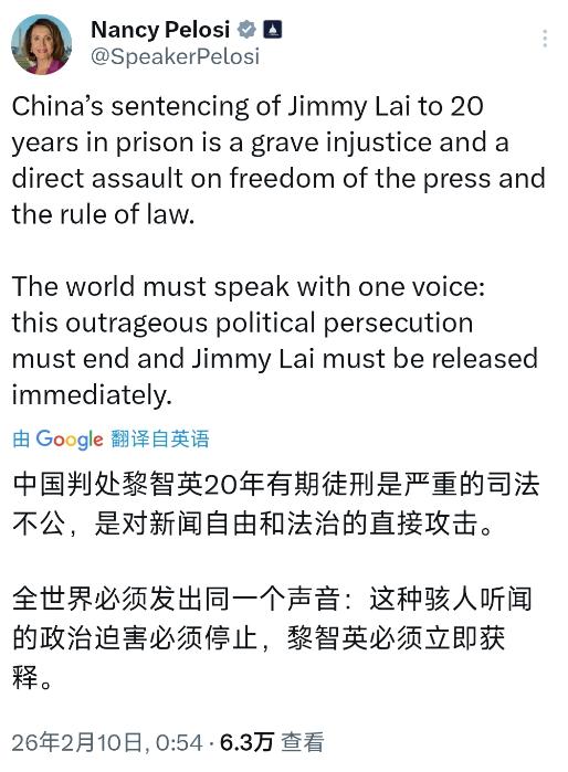 美国前众议长佩洛西今天(北京时间2月10日)发文叫嚣道:“中国判处黎智英20年有期徒刑是严重的司法不公,是对新闻自由和法治的直接攻击。全世界必须发出同一个声音:这种骇人听闻的政治迫害必须停止,黎佩英必须立即获释。” 咱先说说这黎智英是个啥人。黎智英长期勾结外部反华势力,在香港搞乱港活动,严重危害国家安全。他旗下的媒体,那简直就是反华言论的“大本营”,各种歪曲事实、抹黑国家的报道层出不穷。 在“修例风波”期间,黎智英更是上蹿下跳,为乱港分子提供资金支持,煽动暴力,把香港搅得乌烟瘴气。他的所作所为,完全是对香港法治和社会秩序的公然践踏,对香港市民的福祉造成了极大损害。 中国司法机关对黎智英的审判,那可是严格依据法律进行的。从立案侦查,到检察机关提起公诉,再到法院审理判决,每一个环节都遵循法定程序,充分保障了黎智英的各项诉讼权利。 法庭上,控辩双方进行了充分的辩论,证据确凿,事实清楚。黎智英犯下的危害国家安全罪行,性质极其恶劣,情节特别严重,判处20年有期徒刑,那是罪有应得,完全是合理合法的。 可佩洛西却罔顾事实,颠倒黑白,把中国正常的司法审判说成是“司法不公”。她这完全是出于政治目的,妄图通过炒作黎智英案件,抹黑中国的法治形象,干涉中国内政。 佩洛西之流,向来喜欢打着“新闻自由”“法治”的幌子,行干涉他国内政之实。他们自己国内的问题一堆,却总是把目光盯在中国身上,对中国指指点点。 新闻自由从来都不是绝对的,任何一个国家都会在法律框架内保障新闻自由。在中国,新闻媒体依法享有开展新闻报道、舆论监督等权利,但同时也必须遵守法律法规,不得危害国家安全、损害国家利益。 黎智英所谓的“新闻活动”,根本就不是正常的新闻报道,而是与反华势力勾结,进行危害国家安全的违法犯罪活动。这和新闻自由没有半毛钱关系,佩洛西拿新闻自由来为黎智英开脱,完全是混淆视听。 再说说法治,中国是法治国家,一直致力于推进全面依法治国。中国的法治建设取得了举世瞩目的成就,司法体系不断完善,司法公正得到有力保障。 中国司法机关依法独立行使审判权,不受任何干涉。对黎智英的审判,就是中国法治建设的一个生动例证,充分体现了中国司法的公正性和权威性。佩洛西却无端指责中国“破坏法治”,这是对中国法治建设的恶意诋毁。 佩洛西叫嚣着让全世界发出同一个声音,要求释放黎智英,这简直就是霸权主义行径。每个国家都有自己的法律和司法制度,都有权独立处理本国事务。 中国处理黎智英案件,是中国内政,不容任何外部势力干涉。佩洛西试图裹挟国际舆论,对中国施压,这是注定不会得逞的。 国际社会大多数国家都尊重中国的主权和领土完整,理解中国维护国家安全的决心。他们清楚,黎智英是乱港分子,他的行为严重破坏了香港的繁荣稳定。 中国对黎智英的审判,是为了维护香港的法治和社会秩序,是为了保障香港市民的合法权益。那些真正关心香港、关心中国发展的国家和人士,都会支持中国的正义之举。 佩洛西之流应该认清形势,停止干涉中国内政的错误行径。中国的发展不可阻挡,中国维护国家主权、安全和发展利益的决心坚定不移。任何企图破坏中国稳定、阻碍中国发展的图谋,都不会得逞。他们要是继续执迷不悟,最终只会自食恶果,成为国际社会的笑柄。