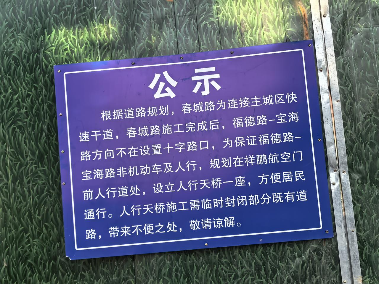 春城路与福德路交叉口这里又围起来了,现在每天上下班高峰期都有交警在指挥,这个路口在修一座横跨春城路上的天桥,工作人员说工期在今年的9月底。到时候宝海路到福德路会断交,中间有隔离栏隔断,修的天桥是供行人及非机动车通人的。也就是说到时候这个样子的话春城在祥鹏航空这个地方就畅通了,没有红绿别了。 他们说工期到9月底的话与春城路到和美路(即409号路)同时完工。看来这条春城路打通到和美路要到今年9月30号了,那也就是说龙湖天街会在今年的笫三季度后国庆节这几天开业。总之只要有人修有人施工就好,不要像前几年停摆在那里,希望昆明的新中心巫家坝片区发展得越来越好!