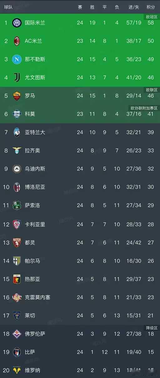 罗马本轮在主场2-0战胜了卡利亚里。亚特兰大、拉齐奥、乌迪内斯和博洛尼亚的积分在30分以上暂列第7-第10名。萨索洛、卡利亚里、都灵、帕尔马、热那亚、克雷莫内塞、莱切暂列第11-第17名。排在最后三名的是18分佛罗伦萨、15分比萨、15分维罗纳!