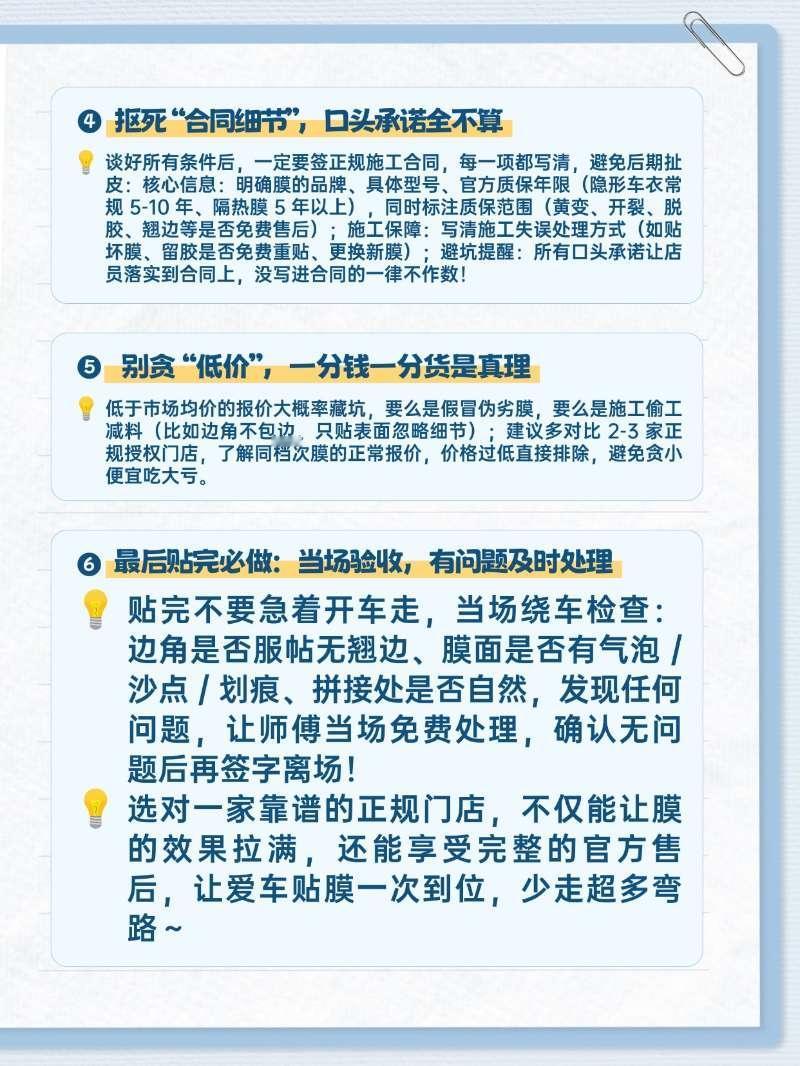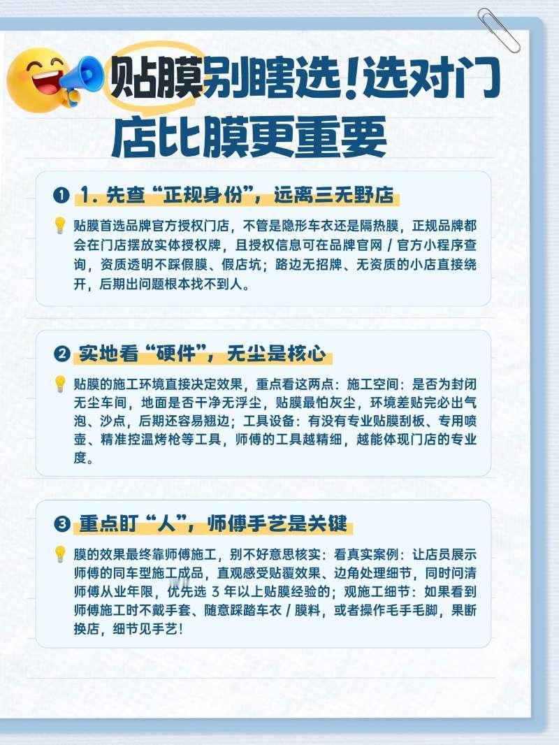 贴膜别瞎选!选对门店比膜更重要第一次给爱车贴膜,选对门店比选膜更关键,选不好不仅贴出气泡、沙点,后续售后还没保障,按这 5 点选,闭眼挑到靠谱门店!【来自懂车帝车友圈】