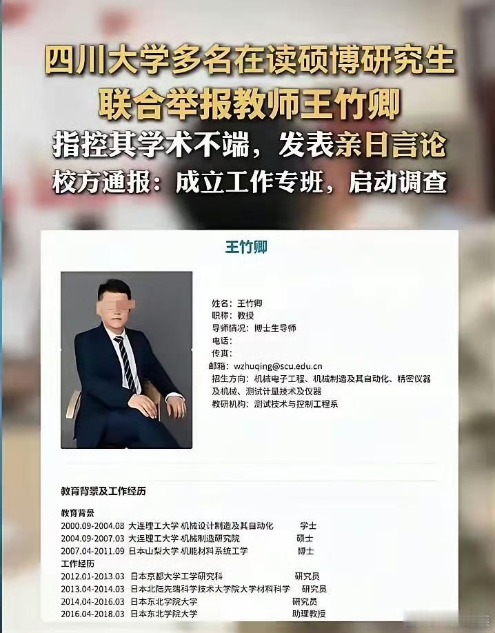 这位博主把川大媚日博导的事情,扒了一个明明白白。才知道这已经不是媚日那么简单了,一个毕业于很一般日本学校的人,却能堂而皇之担任我国重点高校博导。 在我国高校占着编制、垄断着学科资源、还拿着我国人才补贴,却是把科研经费课题组的钱、克扣学生的劳务费等等打到日本账户。用于还日本自己家的房贷、给在日本的女儿交补课费、给岳父体检… 更重要的是学生曝出他有严重的“军国主义思想”,专挑“九一八”这样的日子办国际会议开幕式。而且频繁在群里发送赞美日本的视频,他掌握学生学业命运的权力,让众多学子备受精神煎熬。 如果一切都如博主爆料,那么我们将不得不面对一个痛苦的现实。 那就是我们付出了宝贵的社会资源与财富,却任凭境外势力占据了最好的岗位,手握丰厚课题资金,对我们的莘莘学子形成降维打压。 可以想象在如此恶劣的氛围里,他们究竟想要培养爱国青年还是“媚外恨国党”呢? 所以这绝不是一个人,根源就在于“日满合流”已经深入我国教育系统。 事实胜于雄辩大家只需静待观察,多年之后我们再把很多事件放在一起,互联网的记忆将会给出最终答案。