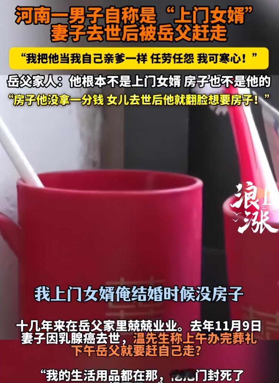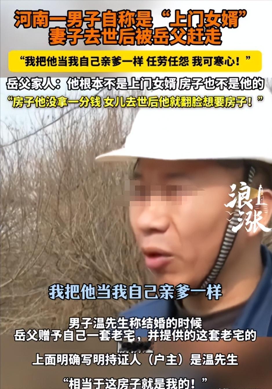 🌙河南平顶山,一42岁男子作为上门女婿,妻子因乳腺癌离世,上午办完葬礼,下午就被岳父和12岁的儿子强行赶出了家门,更让他无法接受的是,岳父竟然直接找人把房子的大门焊死,还贴上了禁止撬门的封条,在门旁装了监控,摆明了就是不让他再踏进这个家门一步。 温先生在镜头前崩溃大哭,反复诉说自己的委屈,他说自己和妻子结婚17年,当初因为自家家庭条件不好,就主动做了上门女婿,这些年他勤勤恳恳,一心为了这个家付出。 妻子6年前查出乳腺癌后,他就放下了手里的工作,专门带着妻子四处求医问药,不管别人说哪种药对病情有帮助,他都会想尽一切办法买回来,无微不至地照顾了妻子整整6年,可到头来,妻子刚走,他就被如此绝情地赶出家门。 温先生说,当初结婚时,岳父曾口头承诺,给他们一套老宅用来安身立命,他和妻子、儿子这17年就一直住在这套房子里,如今妻子不在了,这套房子理应由他继承,毕竟他为这个家付出了这么多,可岳父却翻脸不认人,不仅赶他走,还否认这套房子和他有任何关系。 他还拿出了一份农村集体股权证书,说证书上有他的名字,这就足以证明他是这个家的一份子,房子也该归他所有。 记者跟着温先生找到他的岳父,想要了解事情的真相,可没想到岳父一见到温先生,情绪就瞬间失控,当场就要冲上去动手,嘴里还不停嚷嚷着,自己家里有儿子,按照村里的规矩,根本不可能招上门女婿,温先生说自己是上门女婿,纯粹是胡说八道,有本事就拿出书面证明,别在这里造谣生事。 岳父的儿媳妇,也就是温先生的弟妹,也忍不住站出来反驳,指着温先生的鼻子指责他撒谎,说温先生根本就没在这套老宅里长期住过,这套房子没电没水没厕所,根本不具备居住条件,温先生平日里都和妻子、儿子住在市区的大房子里,只是偶尔回来一趟,连灭火器都只是在这里放过,根本谈不上居住。 面对弟妹的指责,温先生有些慌乱,眼神不停躲闪,一开始还坚持说自己2023年到2025年一直带着妻子、儿子在这里居住,后来又改口说自己在这里住了一年,可当被问到“没电没水怎么住”时,他却支支吾吾,说不出合理的解释。 岳父见状,气得浑身发抖,直接拿出了一份村委开具的证明,上面清清楚楚写着,这套老宅的所有权归岳父所有,和温先生没有任何关系。 岳父告诉记者,温先生根本不是什么上门女婿,他之所以在女儿去世后跳出来闹事,就是想趁机索要房产,想不劳而获。 岳父还说,村里有明确规定,家里有男孩的,一律不准招上门女婿,而且按照当地的风俗,如果真的是上门女婿,孩子就应该跟着女方姓,可温先生的儿子一直跟着温先生姓,这也能证明温先生说的都是假话。 双方各执一词,都声称自己有理,还都拿出了所谓的“证据”,记者也一时难以判断谁对谁错。为了查清事情的真相,记者当即前往当地村委,找到了工作人员核实情况,村委工作人员经过仔细核对相关记录,给出了明确的答复,彻底揭开了这件事的谜底。 村委工作人员表示,经过调查确认,这套老宅确实是温先生岳父的财产,建房的时候,温先生没有出过一分钱、没搬过一块砖,全程都没有参与,而且村里也从来没有认定过温先生是上门女婿。 工作人员还补充说,2002年之后,村里就不再有招上门女婿的说法,除非是家里没有男孩,而温先生的岳父有自己的儿子,根本不符合招上门女婿的条件。 至于温先生拿出的农村集体股权证书,村委工作人员也做出了解释,说这份证书只是证明温先生是村里的集体经济组织成员,享有相应的集体权益,和房屋所有权没有任何关系,不能作为认定房屋归属的依据。村里的知情人也表示,平时很少在村里见到温先生,根本不知道他是所谓的“上门女婿”,大家也都不认可他的这个说法。 面对村委的证明和工作人员的解释,温先生哑口无言,再也说不出反驳的话。记者随后又了解到,温先生在市区确实有一套自己的房子,并非像他所说的那样,一直住在岳父给的老宅里。 他之所以在妻子去世后争夺这套老宅,就是觉得自己照顾了妻子6年,付出了很多,想从岳父这里得到一些补偿。 事情真相大白后,经过记者和村委工作人员的调解,温先生和岳父最终达成了一致意见,温先生不再争夺老宅的所有权,岳父也同意让温先生回去取回自己的个人物品。 一场因为“上门女婿”身份和房屋归属引发的纠纷,终于有了一个结果。温先生原本声称自己付出17年,却落得被赶出家门的下场,看似十分委屈,可真相却让人十分意外。 那么,你觉得温先生的行为值得同情吗?