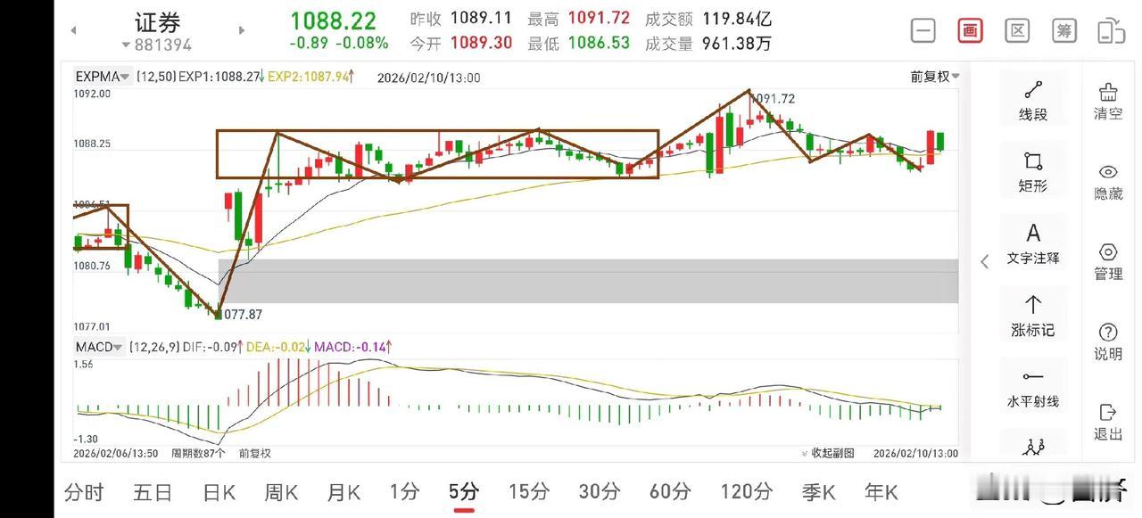 聊聊证券板块(2026.2.10) 今天证券板块走势平稳,仍是处在蓄势整理之中,下午有望继续向上突破,所以此处短线是可考虑积极做多的。 1.从30分钟图一上看,目前正在构建一个30分钟中枢,而且中枢基本确认已经构建完成,下午有望继续向上攀升,走势上只要不破A点,那么在该级别上就是安全的,无忧。 2.从5分钟图二上看,目前正围绕5分钟中枢做上下震荡,截止上午收盘,已经完成了7笔,目前正在向上走第8笔,等第9笔回踩结束,有望向上突破,所以在该级别上走势也没什么问题,可继续考虑持股待涨。 3.商业航天板块调整已接近尾声,后面几天有望小幅上涨,从而构建一个周线中枢结构。走势同样无忧!证券板块动态 现在做券商晚不晚