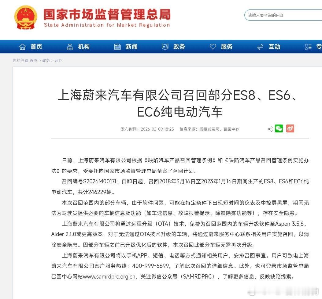 蔚来宣布召回24万余辆汽车【召回原因】黑屏致车速/报警/除霜除雾等关键信息与功能缺失,影响行车安全