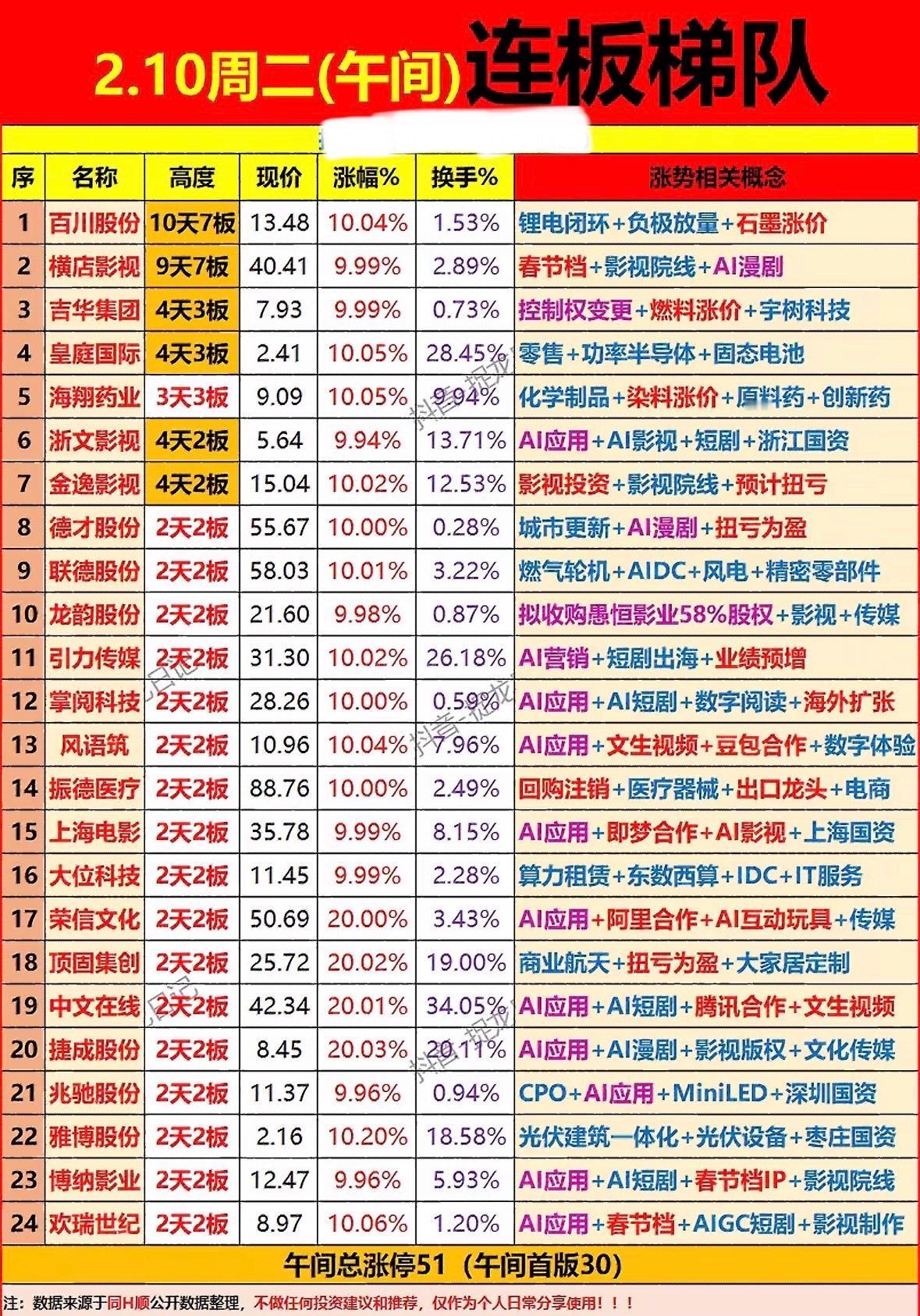 2.10周二午间涨停榜,强势概念股一览! "影视股领涨春节档,AI短剧概念火热,半导体与医药板块活跃,多股连板显强势。"