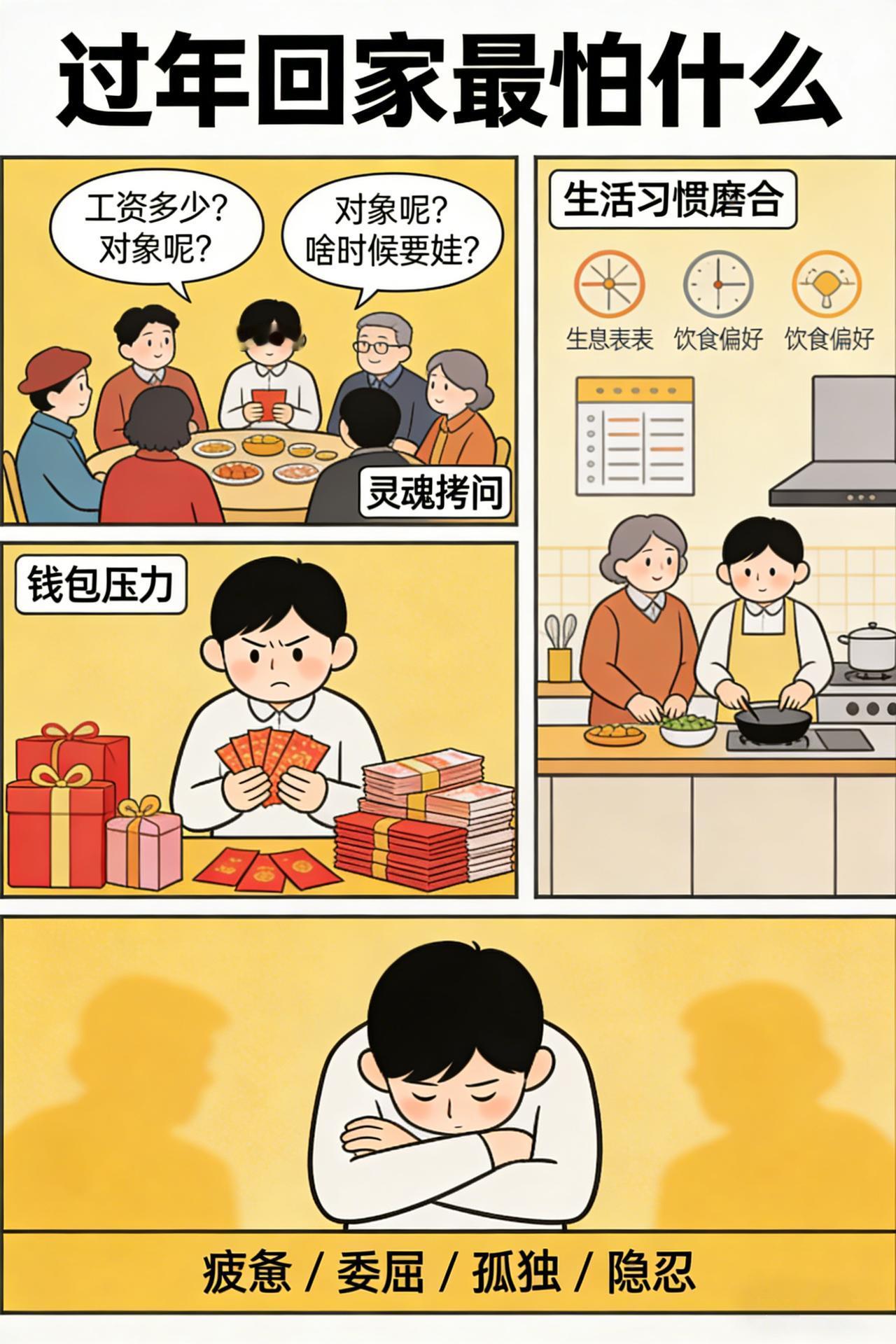 藏不住了!全网过年回家最怕的事是什么? 2月10日10:41,凤凰网在北京发布最新春节返乡调查,已有1610人参与投票。数据显示,催婚催生、问工作收入、家庭矛盾等,成了多数人返乡前最焦虑的问题。 然而,嘴上说着害怕,脚步却依然奔向家乡。一边是年轻人想要的边界感与体面,一边是长辈朴素的关心,两代人的观念碰撞格外真实。不过这些焦虑背后,藏的是在外打拼的疲惫、怕让家人失望的压力,不是真的抵触回家,而是怕被误解、被比较。 这场看似吐槽的调查,其实照见了当代人的真实处境。我们到底该如何平衡亲情与自我?怎样才能让回家只留温暖,少些压力?这样的过年“心结”,又该如何解开?你怎么看?