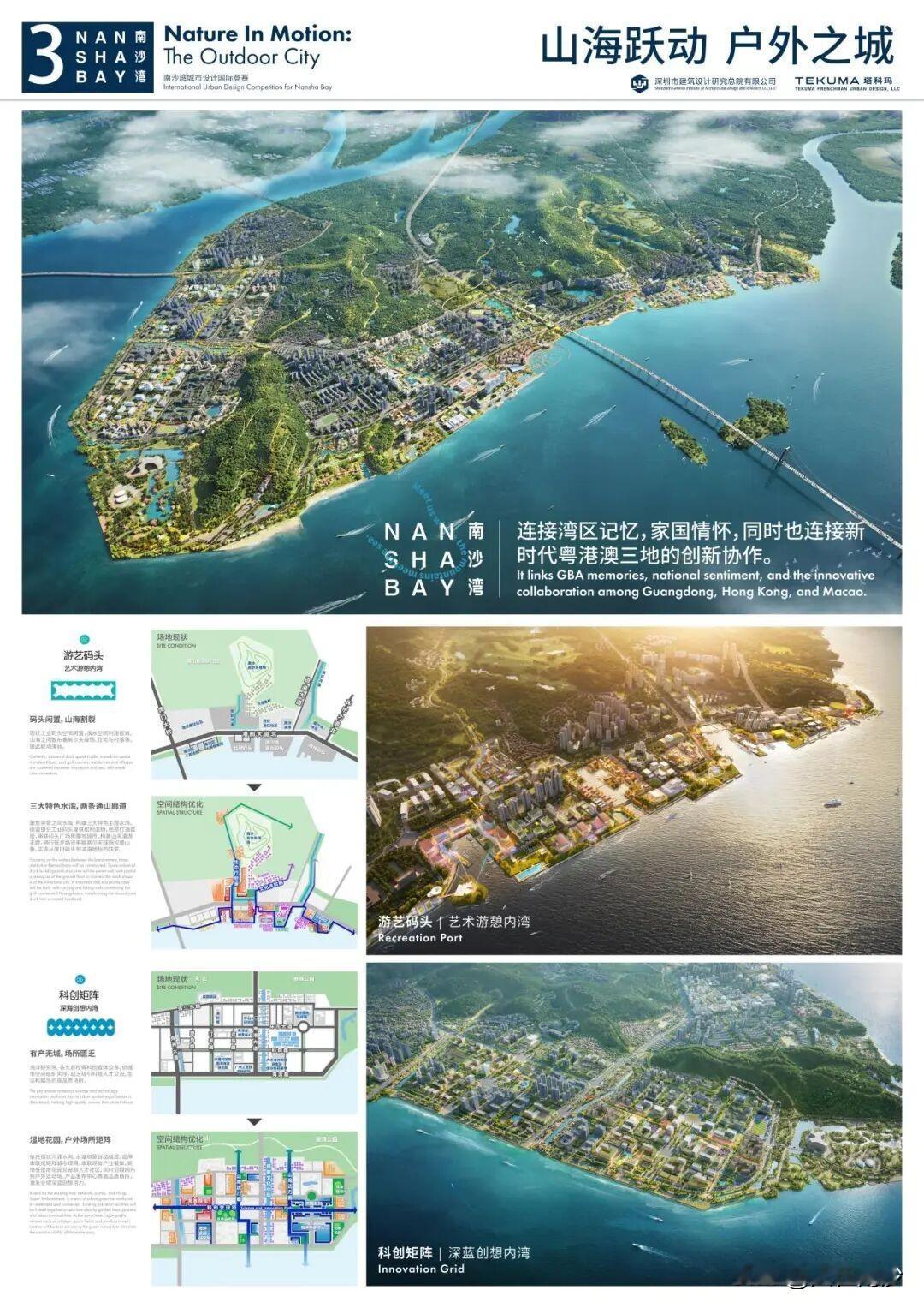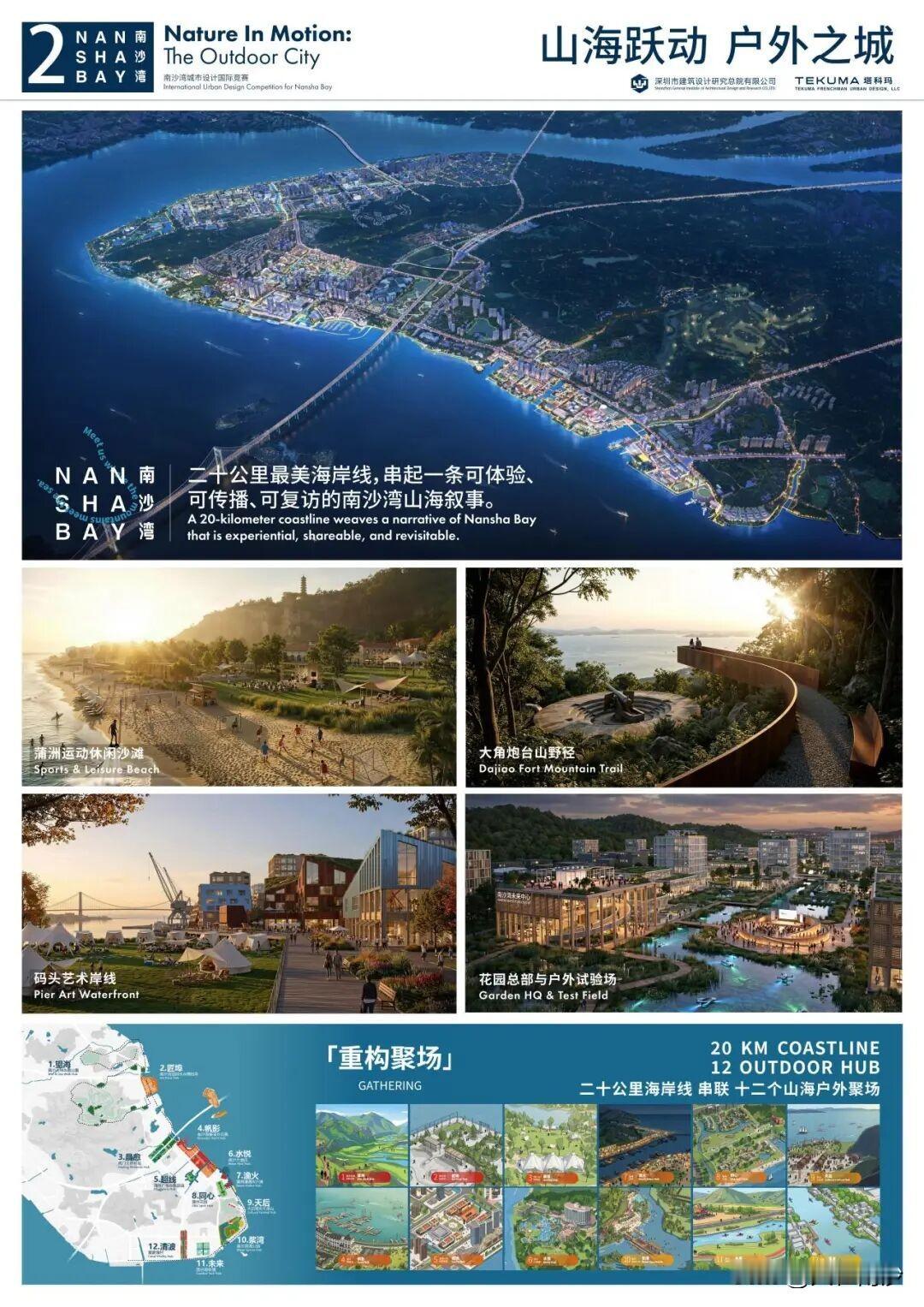 【南沙湾城市设计国际竞赛入选方案赏析】近日,“湾启未来・海韵新章”南沙湾城市设计国际竞赛专业组终评已圆满落幕! 6家由国内外知名设计机构组成的顶尖联合体同台竞技,历经资格遴选、现场调研、方案打磨等多轮考验,最终交出了一份份兼具前瞻性、专业性与落地性的城市设计答卷。 方案五:山海跃动 户外之城 设计单位:深圳市建筑设计研究总院有限公司+TEKUMAFRENCHMANURBANDESIGN,LLC(塔科玛城市设计)联合体 设计方案:方案旨在通过南沙湾未来的开发建设,为大湾区构建一个能与之匹配的假日客厅。在当前品质提升的城市化进程中,方案对南沙湾城市形态的底层逻辑进行重构,从过往强调容积率、日照间距、车道宽度,转变为关注城市的品牌、聚场、动线。 在品牌塑造层面:方案结合南沙湾的核心资源与政策契机,提出“户外型城市”的品牌核心理念,打造“山海跃动 户外之城”的区域超级IP。 在剧场塑造层面:方案通过对山城海空间切片的深度剖析,营造六大特色的外港内湾山海生境,以此形成“一核一带,六区多点”的总体空间结构。同时,以十二个城市聚场为引擎,为20公里美丽海岸线注入持续发生的内容——从风景到场景,从场景到IP,串起一条可体验、可传播、可复访的南沙湾海岸叙事。 在动线塑造层面:方案突破过去建设以车行为导向,效率至上,但缺乏步行体验的城市营造模式。以20公里美丽海岸线和森林公园建设为契机,在滨海岸线和漫山步道之间,通过多元城径链接城市资源。