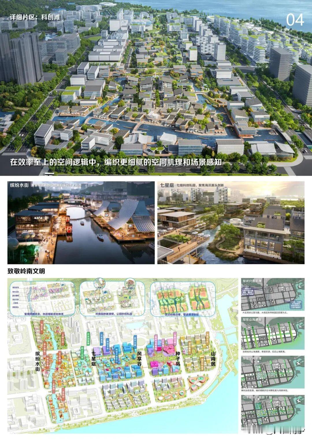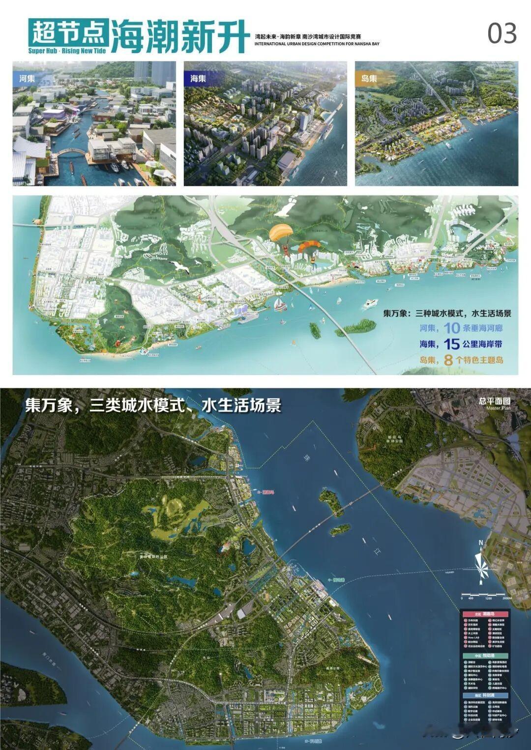 【南沙湾城市设计国际竞赛入选方案赏析】近日,“湾启未来・海韵新章”南沙湾城市设计国际竞赛专业组终评已圆满落幕! 6家由国内外知名设计机构组成的顶尖联合体同台竞技,历经资格遴选、现场调研、方案打磨等多轮考验,最终交出了一份份兼具前瞻性、专业性与落地性的城市设计答卷。 方案四:超节点 海潮新升 设计单位:中国城市规划设计研究院+戴德梁行房地产顾问(广州)有限公司联合体 设计方案:方案以现状十条河涌为脉络,通过上游减法和下游加法,构建从山到海的生态基盘,并形成河集、海集、岛集三类水生活场景,重建人、城、水的关系。 通过锚定潮趣岛、悦动港、科创滩三个潜力节点,实现南沙湾向湾区的链接。 潮趣岛:一条山海带串联四个半岛,以美学生活、运动游乐、数字创意、主题游船为发展重点; 悦动港:植入国际医院、医养、艺术商业等多元新消费场景,实现工作、生活、社交、成长,让人们找回对南沙湾的归属感; 科创滩:打造“科创+居住+消费+休闲”的复合微单元,实现“下楼办公、下楼休憩、水街游弋”的零通勤/短通勤模式。 方案以精细化的建筑肌理创造近人尺度的场所,促进交流交往和魅力体验。游船系统可联通南沙枢纽、蕉门河等周边区域,创造“慢生活”的细腻空间感知。以岭南园林为原型,塑造公园、私园、叠园,分别承载大型公众活动、科创交流、空中花园等多种类型的公共活动。