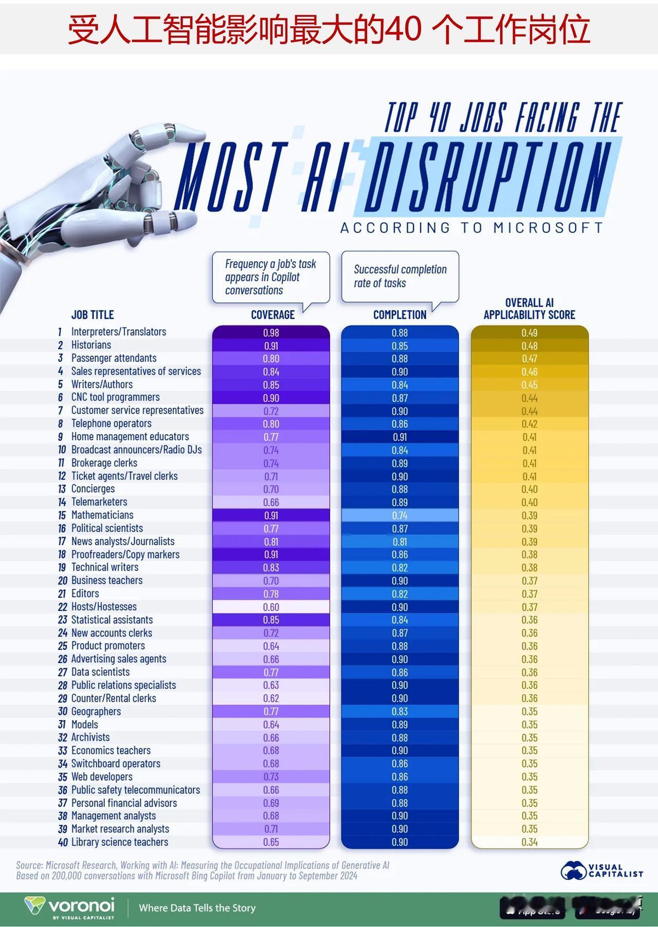 最易受到生成式人工智能影响的工作岗位是什么? 随着生成式人工智能工具的能力不断增强,越来越多的各类职业中的工作任务正逐渐被人工智能所取代。 为了更好地理解这一转变,微软研究院通过研究 2024 年 1 月至 9 月期间与微软必应协作助手进行的超过 20 万次匿名对话,分析了人工智能在实际任务中的适用性。 下面这张信息图表根据微软对人工智能在工作相关任务中的使用频率、完成任务的成效以及人工智能在每个岗位上的适用程度的分析,列出了 40 个受人工智能影响最大的工作岗位。 ——微软如何衡量人工智能暴露 人工智能暴露(AI exposur)指的是个体或职业在工作中接触和使用人工智能技术的程度。它衡量的是AI对不同岗位、行业或任务的渗透水平,通常用于分析AI对就业、工作效率以及职业变迁的影响。 微软通过基于“Copilot”使用情况所得出的三个指标来评估人工智能暴露情况: ※涵盖内容:与某项工作相关的任务在 Copilot 对话中出现的频率。 ※完成情况:Copilot 多少次能够成功完成这些任务。 ※总体人工智能适用性得分:是对人工智能在特定岗位中支持或执行任务的适用性程度的综合衡量指标。 重要的是,高适用性评分并不一定意味着某个工作能够完全实现自动化或被取代。相反,它表明在一个工作角色中,很大一部分任务都可以由生成式人工智能来辅助完成或成功完成。 ——哪些工作最容易受到人工智能的影响? 具有较高人工智能适用性评分的工作通常涉及那些生成式人工智能已经表现良好的领域,包括语言处理、研究、总结和交流等。 根据微软的分析,下图列出了 40 项受人工智能影响最大的工作。 对于口译员和翻译人员而言,0.98 的覆盖率得分表明与这些角色相关的内容在 Copilot 对话中出现得非常频繁,而 0.88 的高完成率得分则表明人工智能能够成功处理其中的许多任务。因此,这些角色的总体 AI 适用性得分最高,为 0.49。 历史学家以及与写作相关的职业也位居排名前列。同样,人工智能聊天系统已经能够处理许多在面向客户岗位上所见的工作,比如销售代表、客服人员、电话营销员和礼宾员等。 虽然创意性和以沟通为主的岗位在榜单中占据主导地位,但诸如数据科学家、网页开发者、管理分析师和市场研究分析师等技术类职位在人工智能的应用方面也表现出了中等至较高的适用性。 有趣的是,在所有 40 个风险最高的工作岗位中,完成情况的平均得分是 0.87——这表明人工智能(在此情况下为“Copilot”)能够成功完成分配给它的对话中的大部分任务。 ——人工智能暴露并不意味着工作会被取消 许多最需要直觉、创造力或人际交往能力的工作,都是人工智能无法替代而只能作为辅助手段的工作。实际上,生成式人工智能更有可能提高每位员工的工作效率,而非完全取代某些岗位。 话虽如此,那些包含重复性和标准化任务的工作可能会更快地发生变革,因为随着人工智能工具在日常工作中应用得越来越广泛,这类工作将会发生相应的变化。 相比之下,那些需要体力劳动和现场即时判断的工作,比如机器操作员、维修工人和护理人员等,与人工智能接触的程度仍然要低得多,因为这些工作仍然难以实现自动化。
