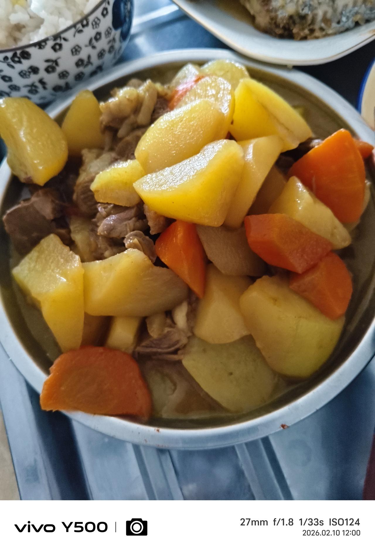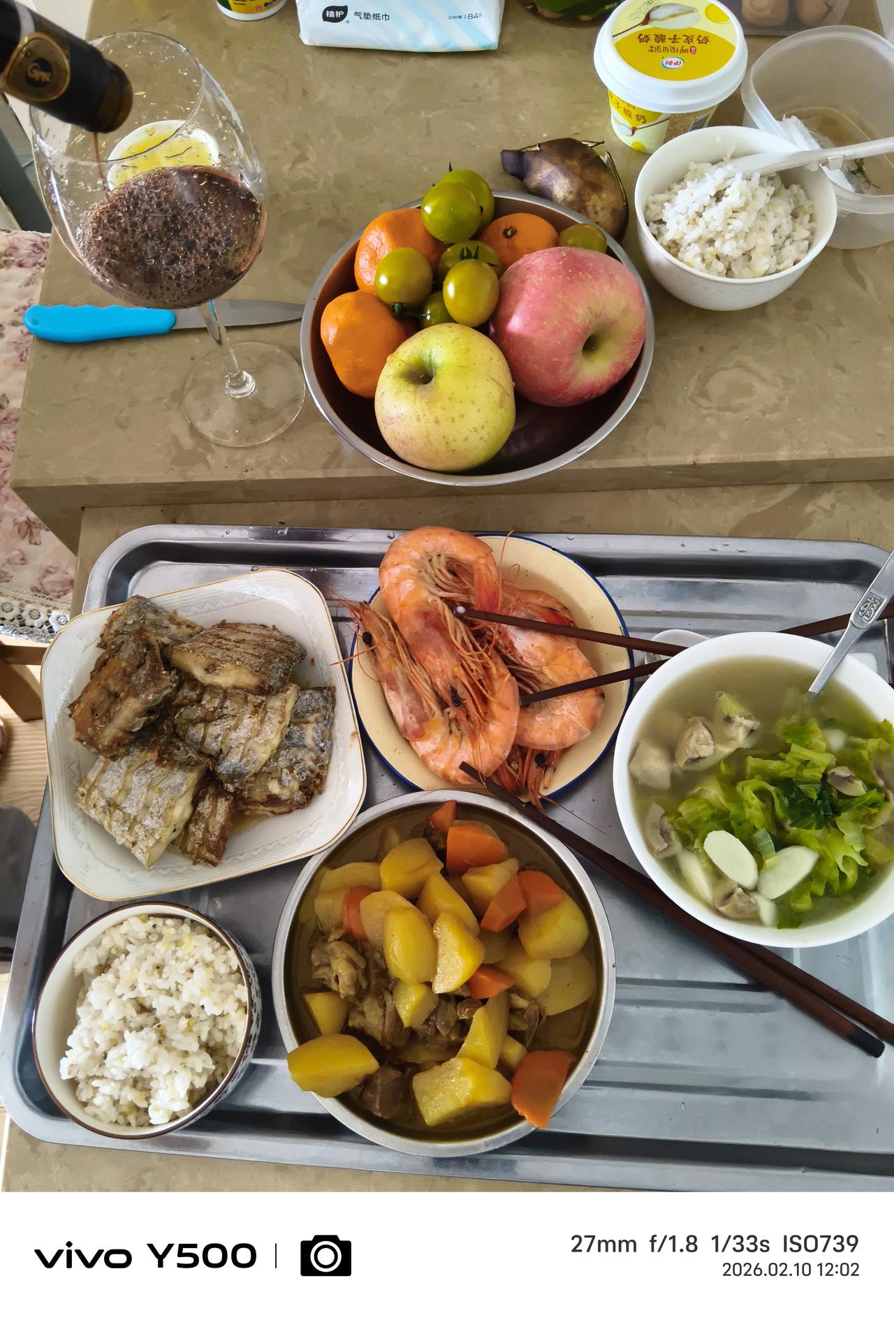 为了庆祝刚刚过去的地震没有人员财产损失; 为了庆祝中国传统的腊月23农历小年。 中午很用心的准备了一桌好菜好饭,表达了对岁月的敬畏。 煎刀鱼、盐水煮大虾、炖牛肉土豆胡萝卜。 青菜蘑菇山药汤。 大米小米青稞米饭。 喝一点点红酒。 感谢过去的时光,憧憬美好的未来,如此而已。