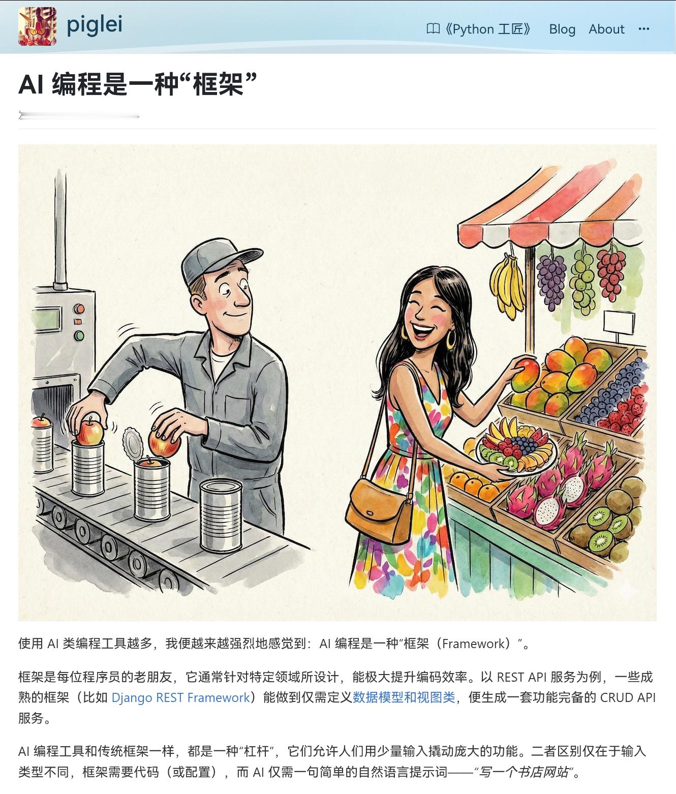 AI 编程是一种“框架”www.piglei.com/articles/ai-programming-is-a-new-framework/不要将 AI 编程作为一种框架,可以尝试将其看作“库”----不再追求“写更少实现更多”:用更少的提示词(代码)实现更多功能,看上去很美,但也意味着大量的认知债务随之累积;----找到编写提示词的“甜蜜区”,付出 相对较少 而非绝对意义上的最少的认知成本;----关注程序结构: 比起在前 AI 时代,你现在可能更需要关注程序的整体结构,作为总设计师去设计整个程序,将正确的结构和约束内化到 AGENTS.md 中;----更精准的提示词: 在理解已有程序的基础上,编写更精准的提示词来引导 AI 完成工作,而不是任其发挥,让 AI 主导一切;----审查代码: 即便使用同一种框架,在遇到棘手问题时,一位熟读框架文档的人也会比另一位愣头青更有效率,如果把 AI 编写的代码归为框架,那么你应该去审查这份代码,从而在不可避免的“抽象泄露”发生时,将其所产生的危害降到最低。HOW I AI