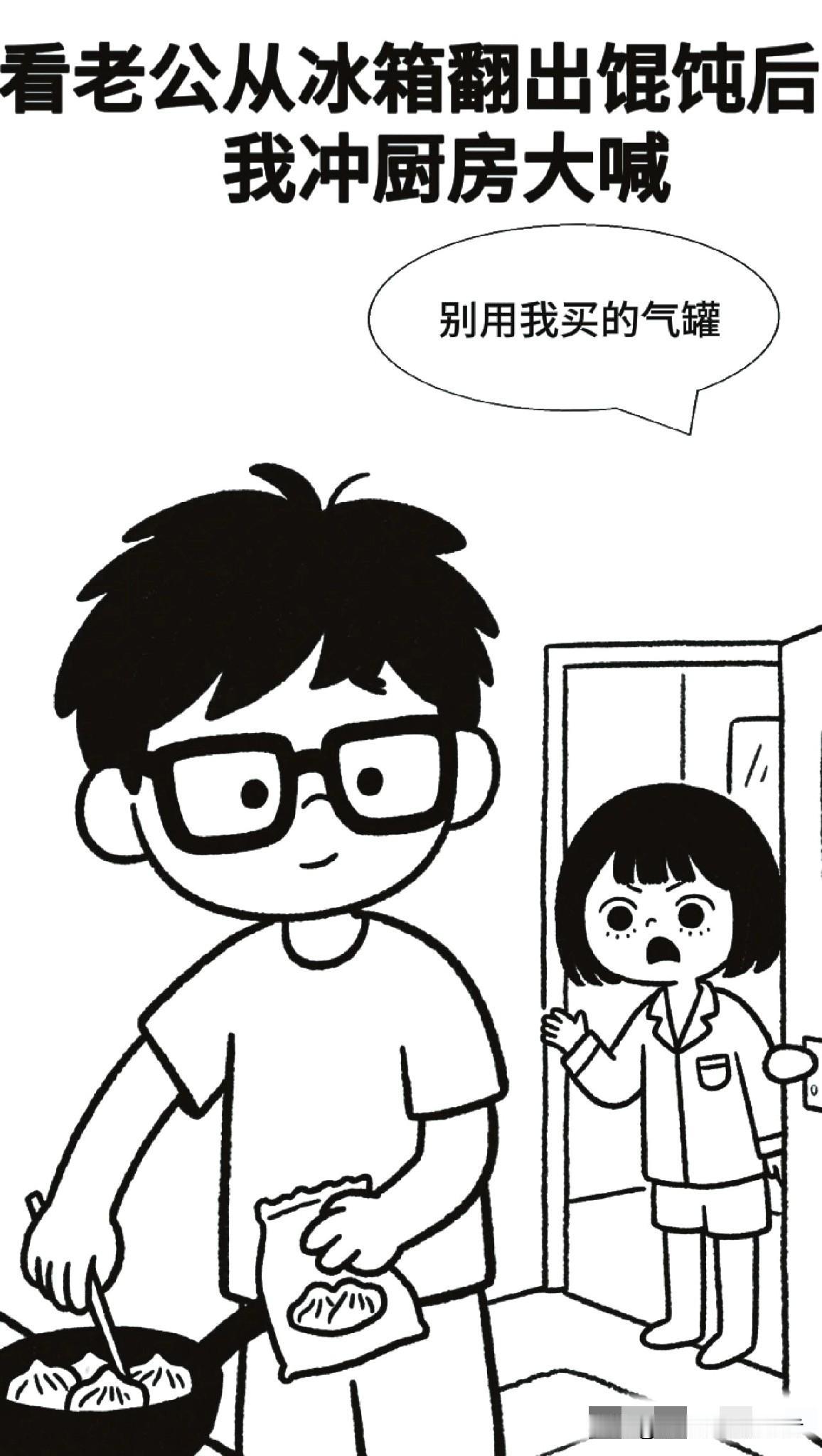 趣味漫画:和老公吵完架,我赌气不做饭。他翻出馄饨要自己煮,我冲厨房大喊:别用我买的气罐,没一会,只听他在屋里嘀咕:那我自己放屁煮