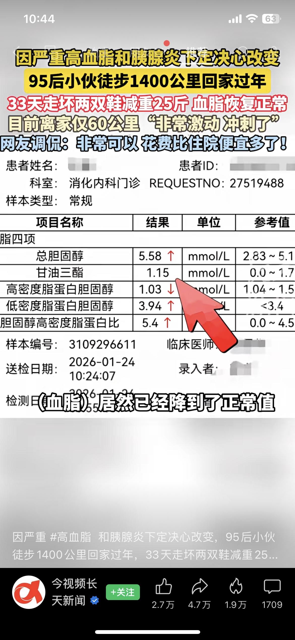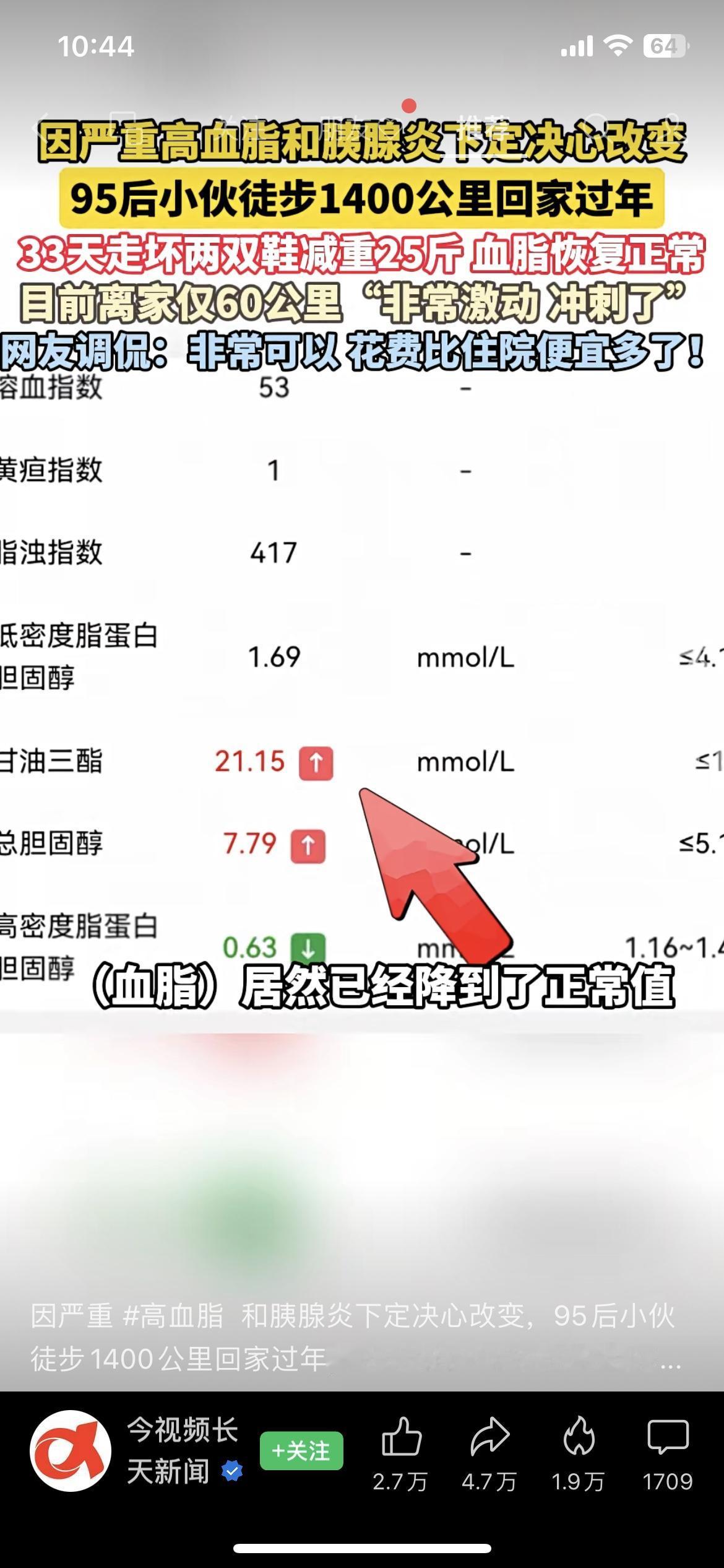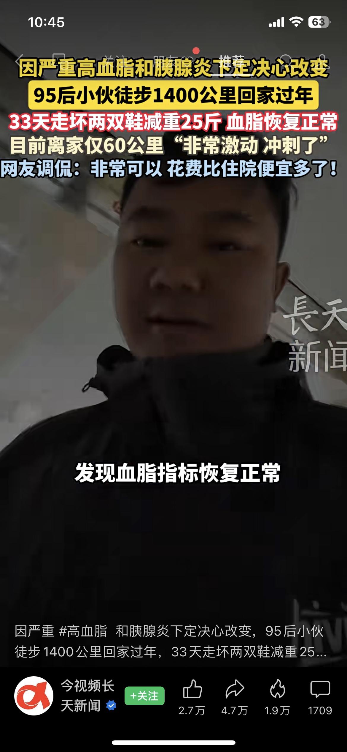 1400公里走回家!95后小伙减重25斤,血脂直接正常了 为了治高血脂和胰腺炎,95后小伙愣是靠走路回家过年,33天走坏两双鞋,不光体重掉了25斤,连高血脂都走没了!网友笑称:这住院费省得太值了。说白了,最好的药,有时候就是迈开腿、管住嘴。我们总说“等有空再养生”,但健康从来不是等出来的。 你会为了健康,试试这种“硬核”方式吗?站队! 民生热点 健康生活 95后小伙徒步回家 高血脂血脂下降 血脂运动