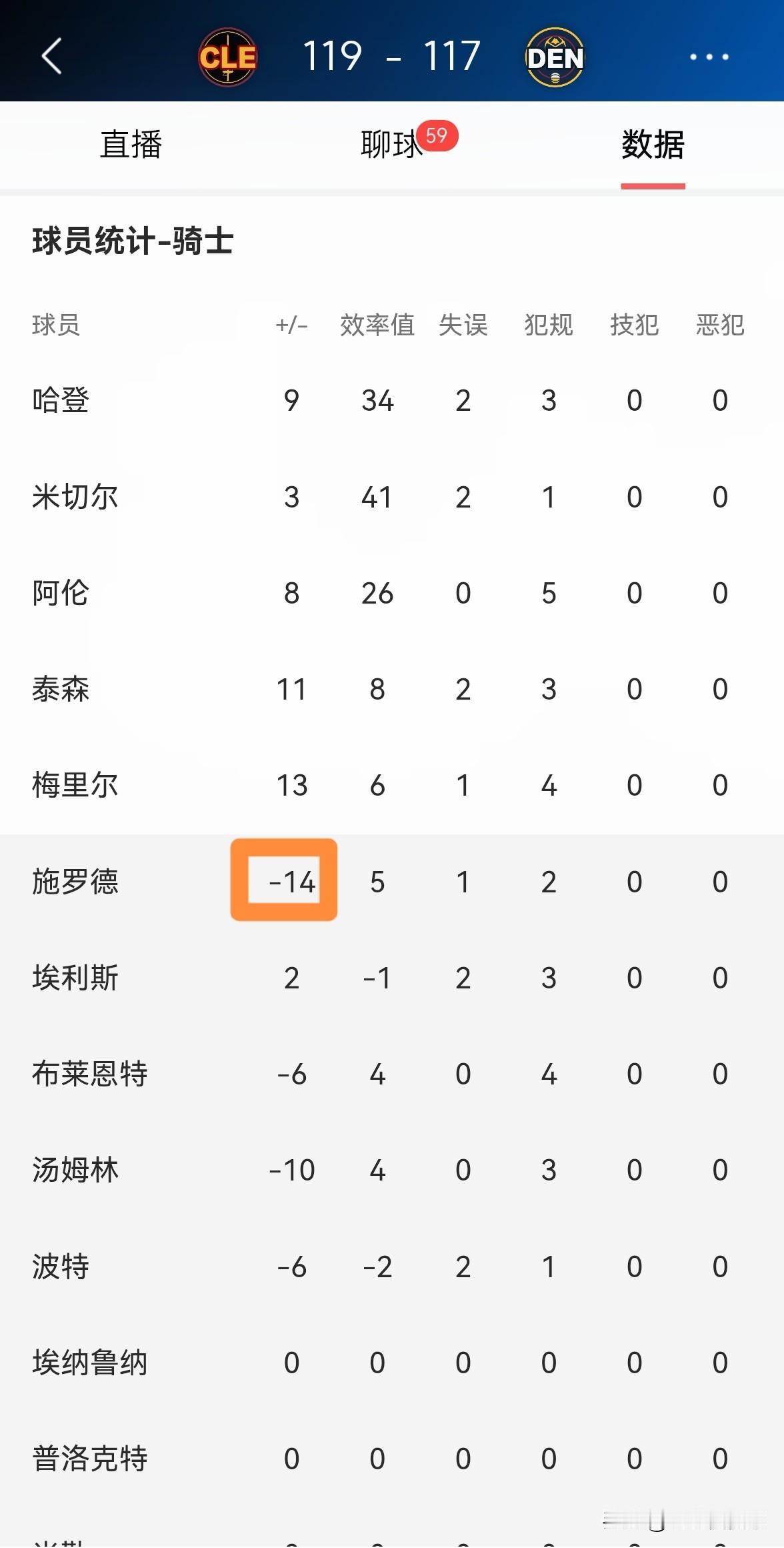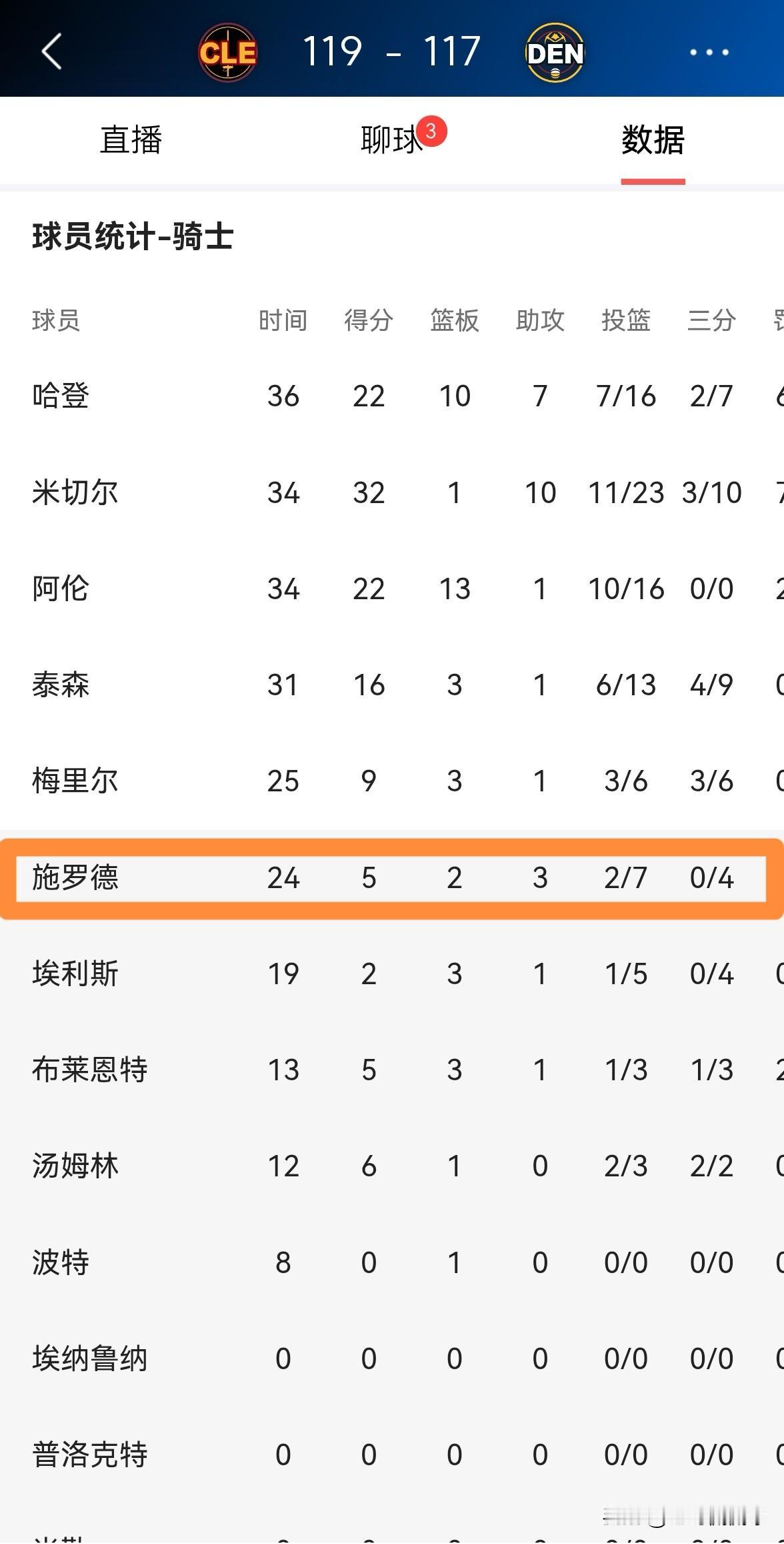 骑士新援施罗德真是大失水准!虽然今天骑士在客场以119:117险胜掘金,但是施罗德在进攻端的表现却大失水准,尤其是在三分球方面的表现更是非常的糟糕。 整场比赛下来,施罗德替补出战24分钟,投篮7中2,其中三分球4中0、罚球2中1非常低效的得到5分,他的场上正负值为球队最低的-14。