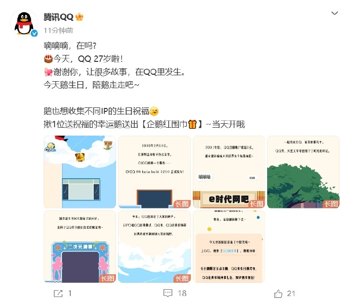 腾讯QQ诞生27周年今天是腾讯QQ诞生的第27周年纪念日。腾讯官方发文回顾过往:1999年2月10日,OICQ的第一个版本OICQ 99 beta build 0210在深圳的格子办公室正式发布。2000年10月,腾讯创始团队拍摄了企鹅造型演变的照片。2001年后,QQ注册账户数超1亿,使用范围逐渐扩大。随着发展,QQ成为不同兴趣圈子同好的聚集地,出现了如奥运在线传递火炬、偷菜、频道约逛展搭子、闪传图片、发空间等丰富多样的用户活动。如今QQ还逐步开始找回当年的经典功能,上演了一出回忆杀:2025年12月8日PC端QQ经典模式回归;2026年01月24日QQ秀全新回归;2026年2月6日QQ农场经典回归。还记的你是哪一年注册的QQ号吗?回顾QQ27年历程